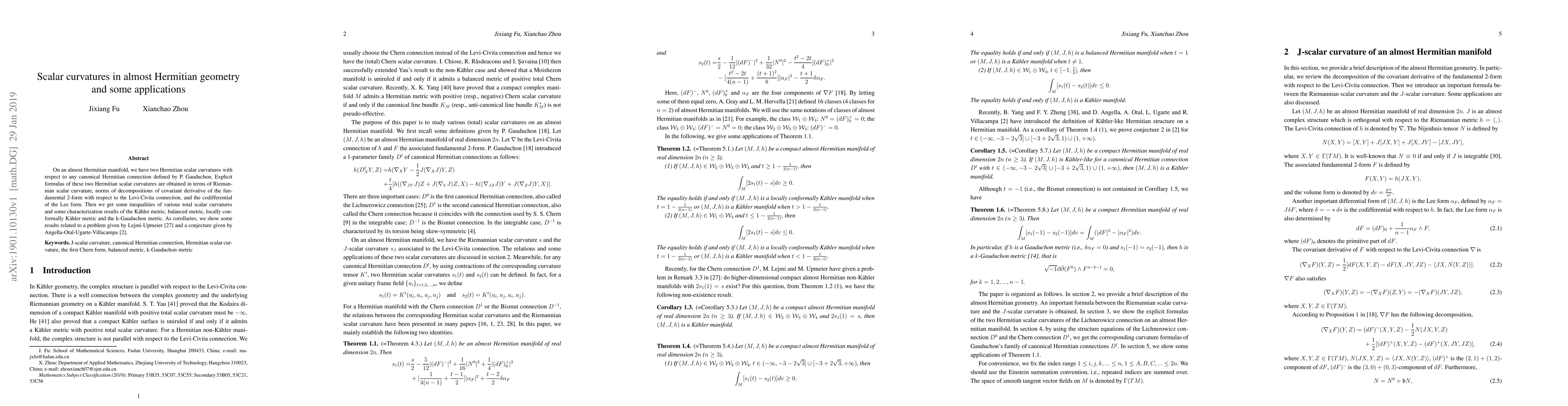 On an almost Hermitian manifold, we have two Hermitian scalar curvatures with respect to any canonical Hermitian connection defined by P. Gauduchon. Explicit formulas of these two Hermitian scalar curvatures are obtained in terms of Riemannian scalar curvature, norms of decompositions of covariant derivative of the fundamental 2-form with respect to the Levi-Civita connection, and the codifferential of the Lee form. Then we get some inequalities of various total scalar curvatures and some characterization results of the K\"{a}hler metric, balanced metric, locally conformally K\"{a}hler metric and the k-Gauduchon metric. As corollaries, we show some results related to a problem given by Lejmi-Upmeier \cite{LeU} and a conjecture given by Angella-Otal-Ugarte-Villacampa \cite{AOUV}.