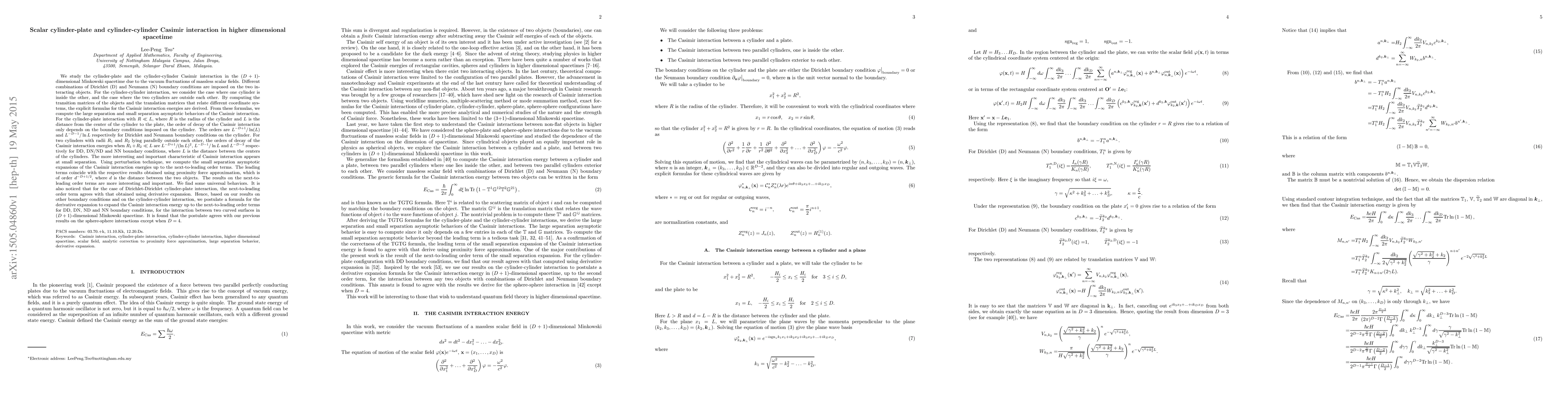 We study the cylinder-plate and the cylinder-cylinder Casimir interaction in the $(D+1)$-dimensional Minkowski spacetime due to the vacuum fluctuations of massless scalar fields. Different combinations of Dirichlet (D) and Neumann (N) boundary conditions are imposed on the two interacting objects. For the cylinder-cylinder interaction, we consider the case where one cylinder is inside the other, and the case where the two cylinders are outside each other. By computing the transition matrices of the objects and the translation matrices that relate different coordinate systems, the explicit formulas for the Casimir interaction energies are derived. Using perturbation technique, we compute the small separation asymptotic expansions of the Casimir interaction energies up to the next-to-leading order terms. The leading terms coincide with the respective results obtained using proximity force approximation, which is of order $d^{-D+1/2}$, where $d$ is the distance between the two objects. The results on the next-to-leading order terms are more interesting and important. We find some universal behaviors. It is also noticed that for the case of Dirichlet-Dirichlet cylinder-plate interaction, the next-to-leading order term agrees with that obtained using derivative expansion. Hence, based on our results on other boundary conditions and on the cylinder-cylinder interaction, we postulate a formula for the derivative expansion to expand the Casimir interaction energy up to the next-to-leading order terms for DD, DN, ND and NN boundary conditions, for the interaction between two curved surfaces in $(D+1)$-dimensional Minkowski spacetime. It is found that the postulate agrees with our previous results on the sphere-sphere interactions except when $D=4$.