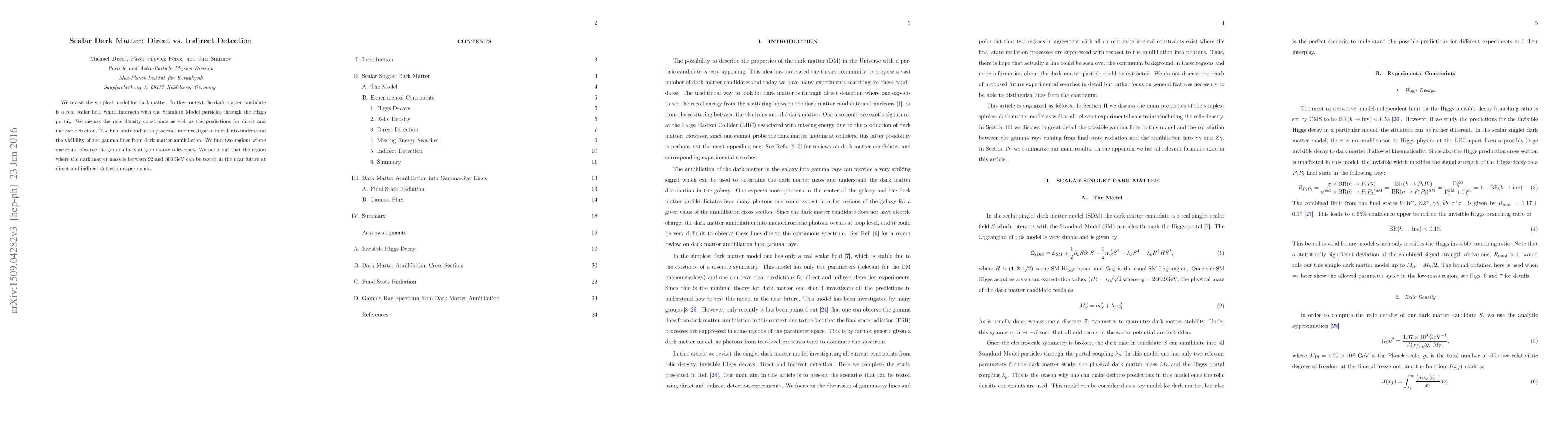 This paper explores a scalar dark matter model interacting via the Higgs portal, analyzing relic density constraints and predictions for both direct and indirect detection. It identifies two regions where gamma lines from dark matter annihilation could be observed, particularly emphasizing the potential for near-future detection in the mass range of 92 to 300 GeV.