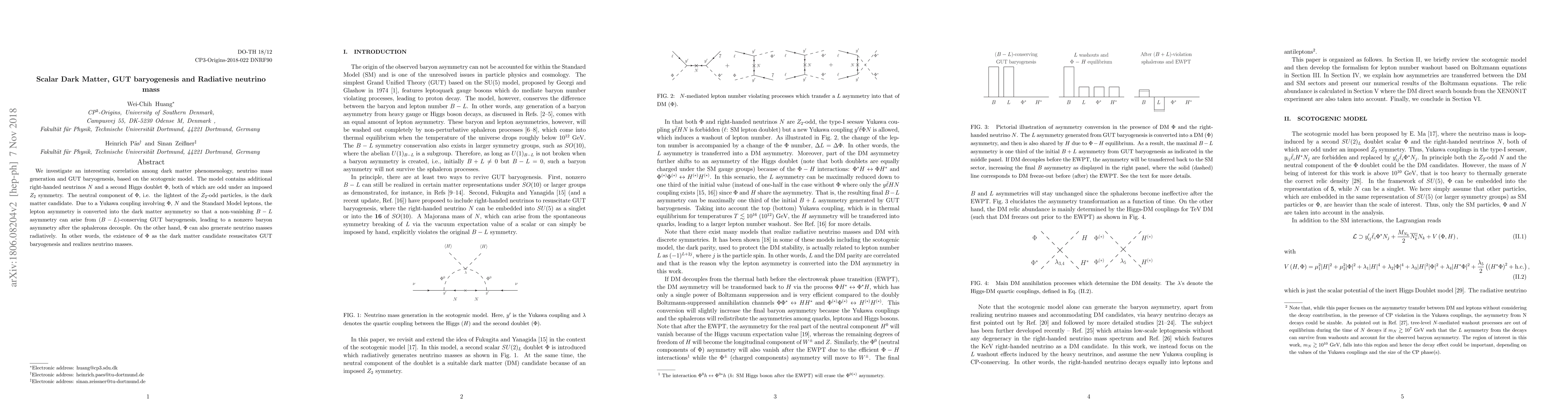 This paper explores a scotogenic model where scalar dark matter, GUT baryogenesis, and radiative neutrino masses are interconnected. The model introduces right-handed neutrinos and a second Higgs doublet, enabling the conversion of lepton asymmetry into dark matter asymmetry, thus facilitating GUT baryogenesis and radiative neutrino mass generation.