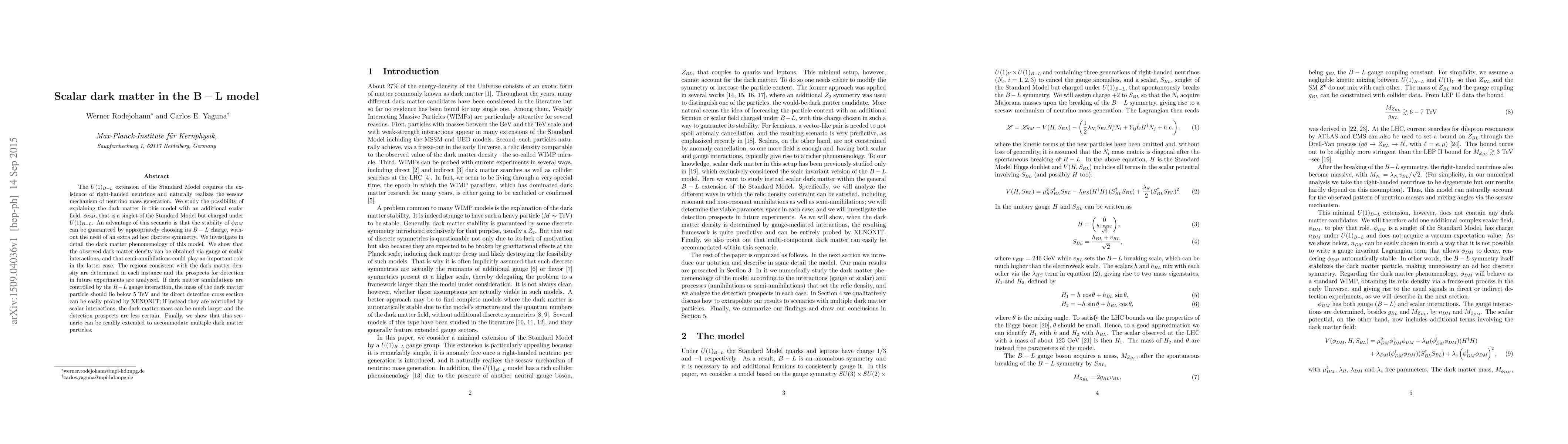 This paper explores scalar dark matter within the B-L extended Standard Model, proposing a stable scalar singlet charged under $U(1)_{B-L}$ to explain dark matter. The study investigates its phenomenology and potential detection, finding that dark matter mass and detection prospects depend on whether gauge or scalar interactions dominate its annihilations.