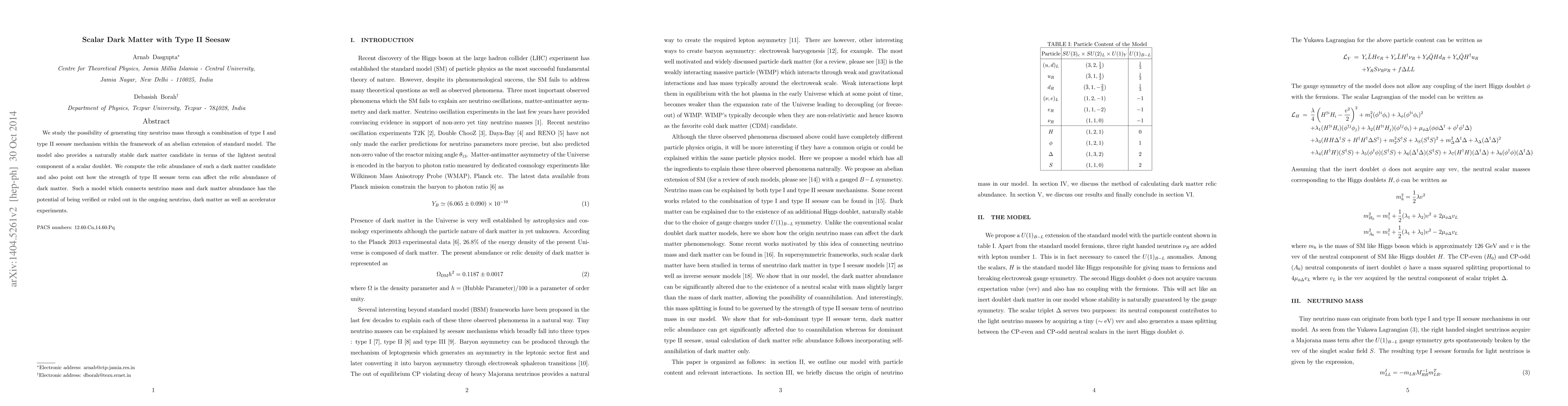 This paper explores a combined type I and type II seesaw mechanism in an extended standard model to generate small neutrino masses and proposes a stable scalar dark matter candidate. It analyzes the relic abundance of this dark matter and discusses how the type II seesaw strength influences it, suggesting potential experimental verification avenues.