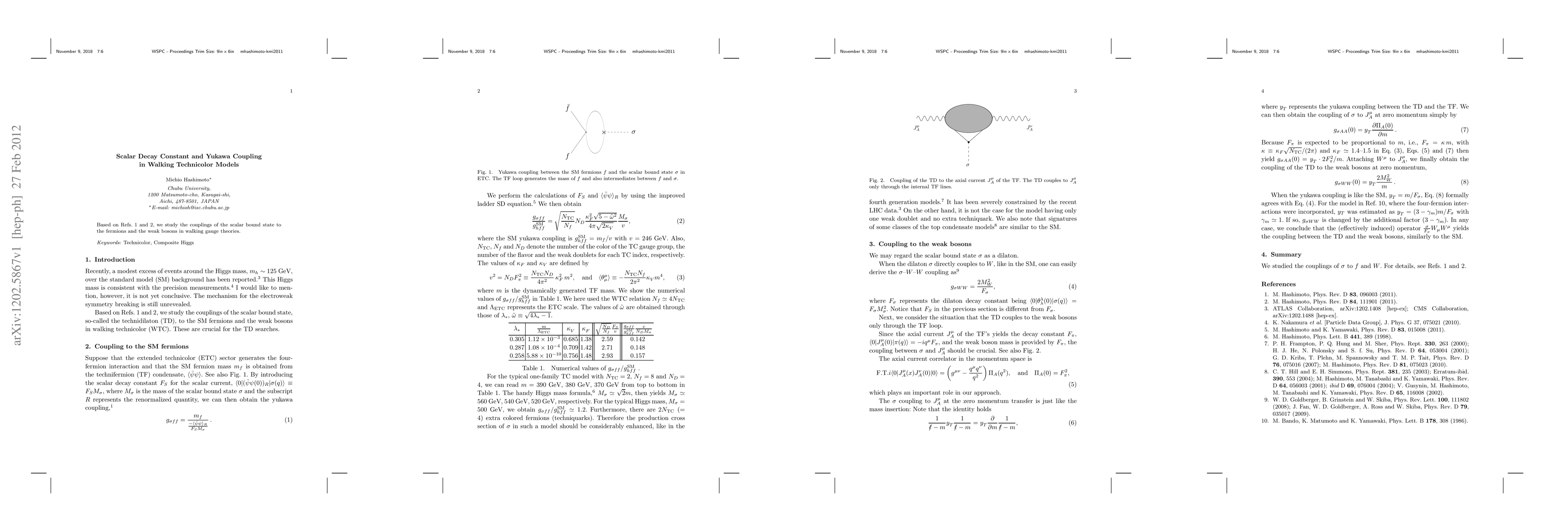 This research investigates the interaction of scalar particles with fermions and weak bosons in walking gauge theories, building upon previous works, to understand the behavior of Yukawa couplings and decay constants in Technicolor models.