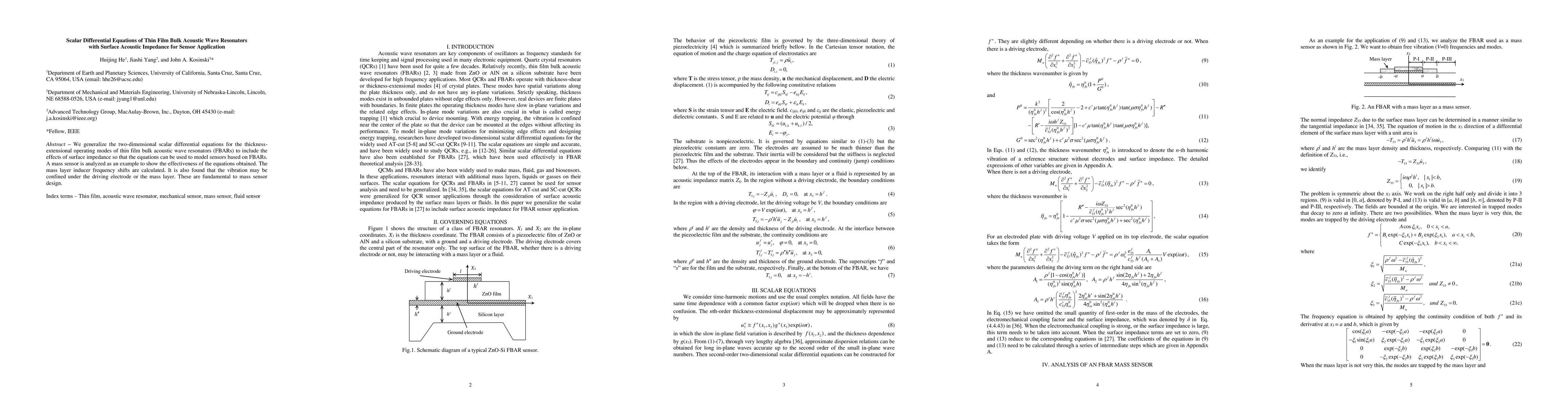 The paper presents a system of scalar differential equations that model the effects of surface impedance in thin film bulk acoustic wave resonators, enabling accurate prediction of frequency sensitivity and energy trapping modes for sensor applications.