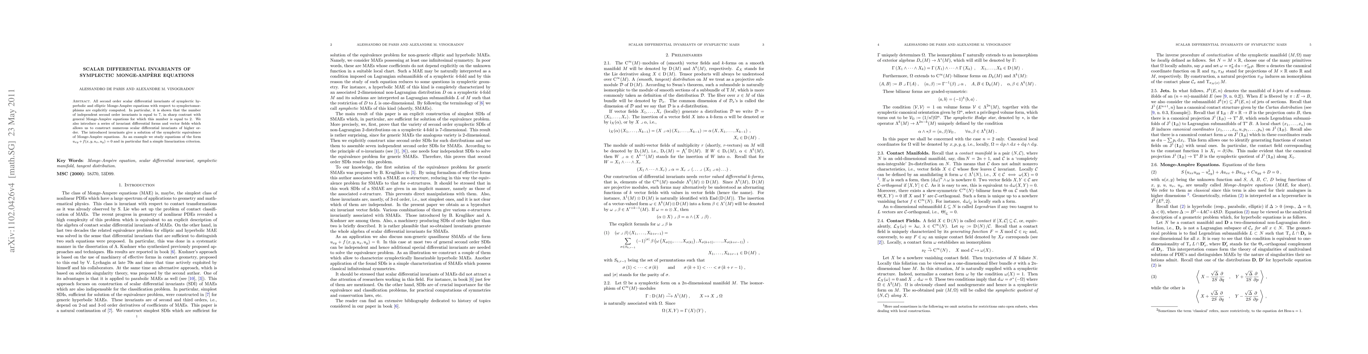 This paper computes all second-order scalar differential invariants for symplectic hyperbolic and elliptic Monge-Ampère equations under symplectomorphisms, revealing 7 independent invariants, contrasting with 2 for general Monge-Ampère equations. It introduces higher-order invariants via invariant differential forms and vector fields, providing a solution for symplectic equivalence of these equations.