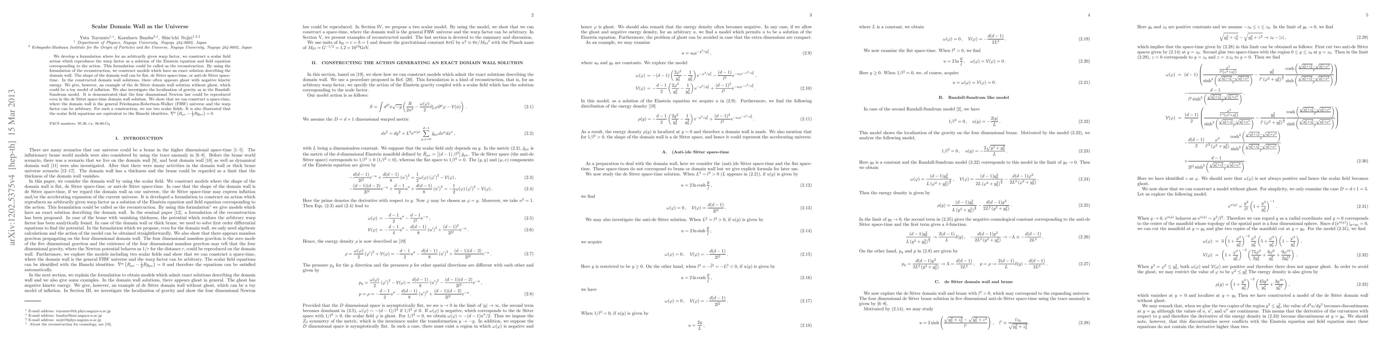 We develop a formulation where for an arbitrarily given warp factor, we construct a scalar field action which reproduces the warp factor as a solution of the Einstein equation and field equation corresponding to the action. This formulation could be called as the reconstruction. By using the formulation of the reconstruction, we construct models which have an exact solution describing the domain wall. The shape of the domain wall can be flat, de Sitter space-time, or anti-de Sitter space-time. In the constructed domain wall solutions, there often appears ghost with negative kinetic energy. We give, however, an example of the de Sitter domain wall solution without ghost, which could be a toy model of inflation. We also investigate the localization of gravity as in the Randall-Sundrum model. It is demonstrated that the four dimensional Newton law could be reproduced even in the de Sitter space-time domain wall solution. We show that we can construct a space-time, where the domain wall is the general Friedmann-Robertson-Walker (FRW) universe and the warp factor can be arbitrary. For such a construction, we use two scalar fields. It is also illustrated that the scalar field equations are equivalent to the Bianchi identities: $\nabla^\mu (R_{\mu\nu} - \frac{1}{2}R g_{\mu\nu})=0$.