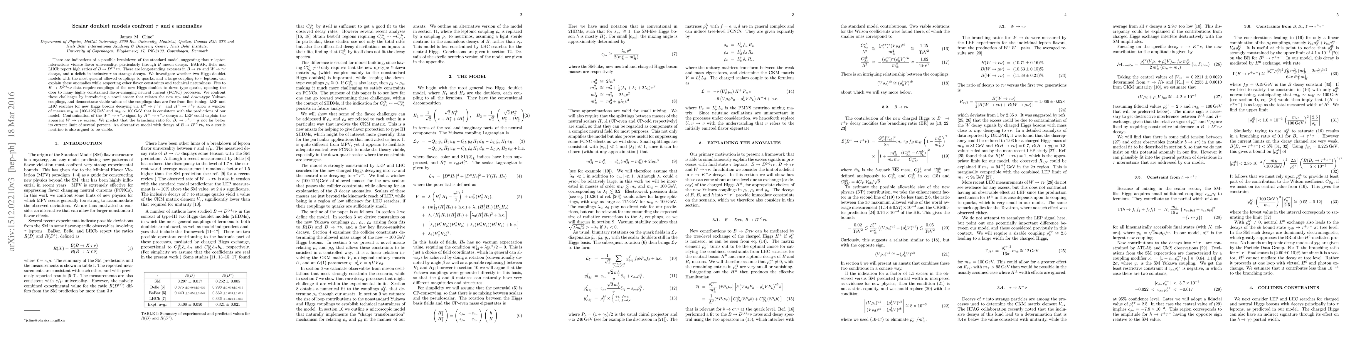 This paper explores scalar doublet models to explain anomalies in $\tau$ lepton and $b$ quark interactions, suggesting a breakdown of flavor universality in the Standard Model. It proposes a novel ansatz to reconcile new Higgs doublet couplings with observed decay ratios, predicting viable masses for new Higgs bosons consistent with experimental data and addressing potential $W\to\tau\nu$ excess.