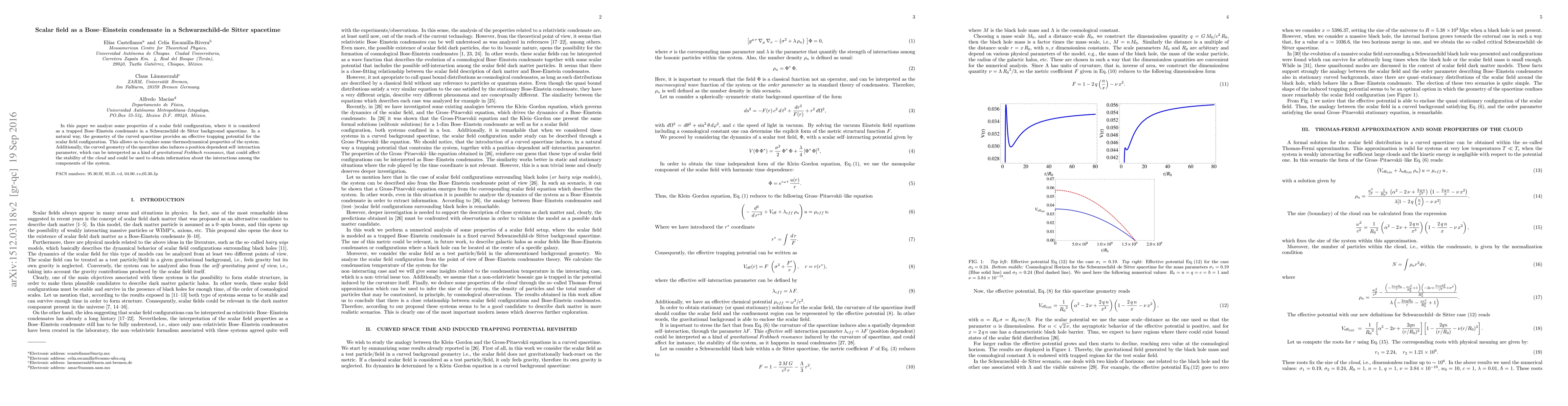 In this paper we analyze some properties of a scalar field configuration, where it is considered as a trapped Bose-Einstein condensate in a Schwarzschild-de Sitter background spacetime. In a natural way, the geometry of the curved spacetime provides an effective trapping potential for the scalar field configuration. This allows us to explore some thermodynamical properties of the system. Additionally, the curved geometry of the spacetime also induces a position dependent self-interaction parameter, which can be interpreted as a kind of gravitational Feshbach resonance, that could affect the stability of the cloud and could be used to obtain information about the interactions among the components of the system..