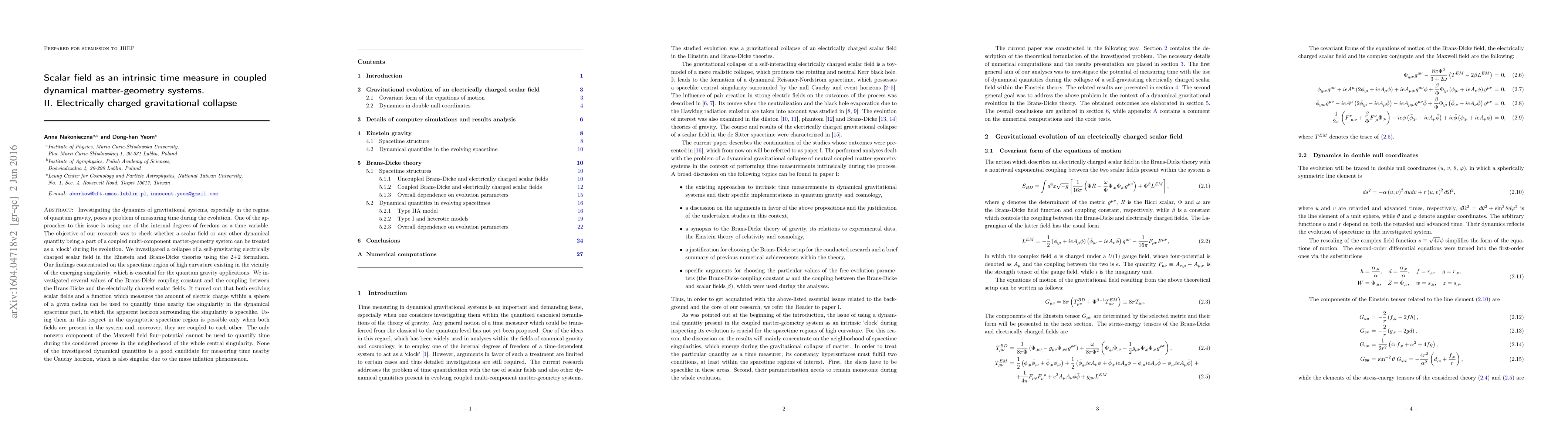 Investigating the dynamics of gravitational systems, especially in the regime of quantum gravity, poses a problem of measuring time during the evolution. One of the approaches to this issue is using one of the internal degrees of freedom as a time variable. The objective of our research was to check whether a scalar field or any other dynamical quantity being a part of a coupled multi-component matter-geometry system can be treated as a `clock' during its evolution. We investigated a collapse of a self-gravitating electrically charged scalar field in the Einstein and Brans-Dicke theories using the 2+2 formalism. Our findings concentrated on the spacetime region of high curvature existing in the vicinity of the emerging singularity, which is essential for the quantum gravity applications. We investigated several values of the Brans-Dicke coupling constant and the coupling between the Brans-Dicke and the electrically charged scalar fields. It turned out that both evolving scalar fields and a function which measures the amount of electric charge within a sphere of a given radius can be used to quantify time nearby the singularity in the dynamical spacetime part, in which the apparent horizon surrounding the singularity is spacelike. Using them in this respect in the asymptotic spacetime region is possible only when both fields are present in the system and, moreover, they are coupled to each other. The only nonzero component of the Maxwell field four-potential cannot be used to quantify time during the considered process in the neighborhood of the whole central singularity. None of the investigated dynamical quantities is a good candidate for measuring time nearby the Cauchy horizon, which is also singular due to the mass inflation phenomenon.