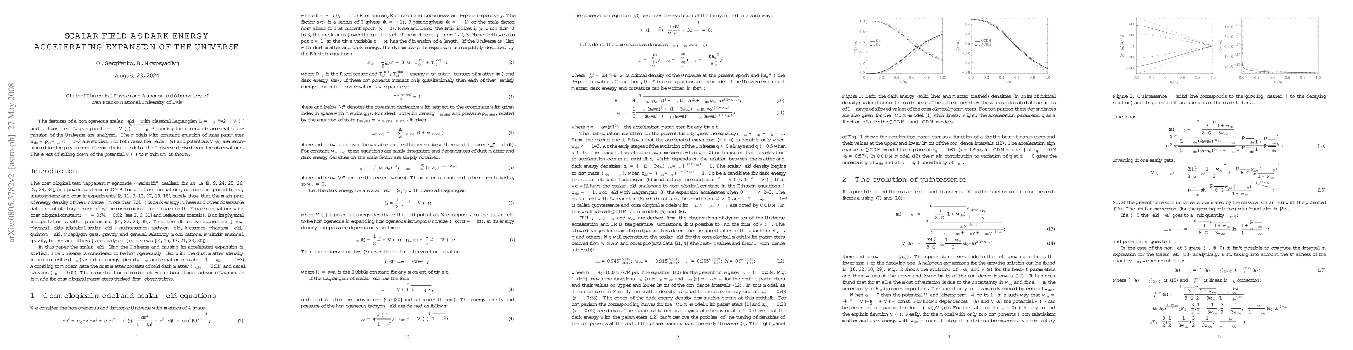 The features of a homogeneous scalar field $\phi$ with classical Lagrangian $L=\phi_{;i}\phi^{;i}/2-V(\phi)$ and tachyon field Lagrangian $L=-V(\phi)\sqrt{1-\phi_{;i}\phi^{;i}}$ causing the observable accelerated expansion of the Universe are analyzed. The models with constant equation-of-state parameter $w_{de}=p_{de}/\rho_{de}<-1/3$ are studied. For both cases the fields $\phi(a)$ and potentials $V(a)$ are reconstucted for the parameters of cosmological model of the Universe derived from the observations. The effect of rolling down of the potential $V(\phi)$ to minimum is shown.