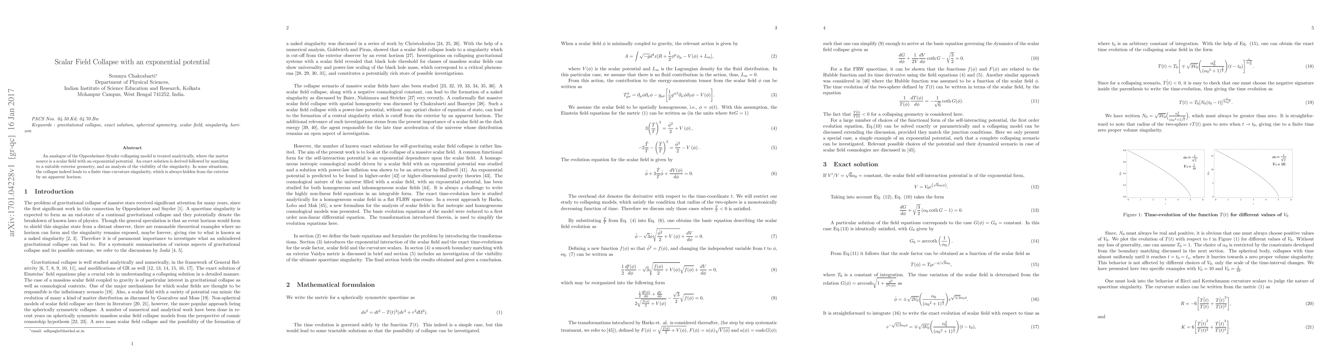 An analogue of the Oppenheimer-Synder collapsing model is treated analytically, where the matter source is a scalar field with an exponential potential. An exact solution is derived followed by matching to a suitable exterior geometry, and an analysis of the visibility of the singularity. In some situations, the collapse indeed leads to a finite time curvature singularity, which is always hidden from the exterior by an apparent horizon.