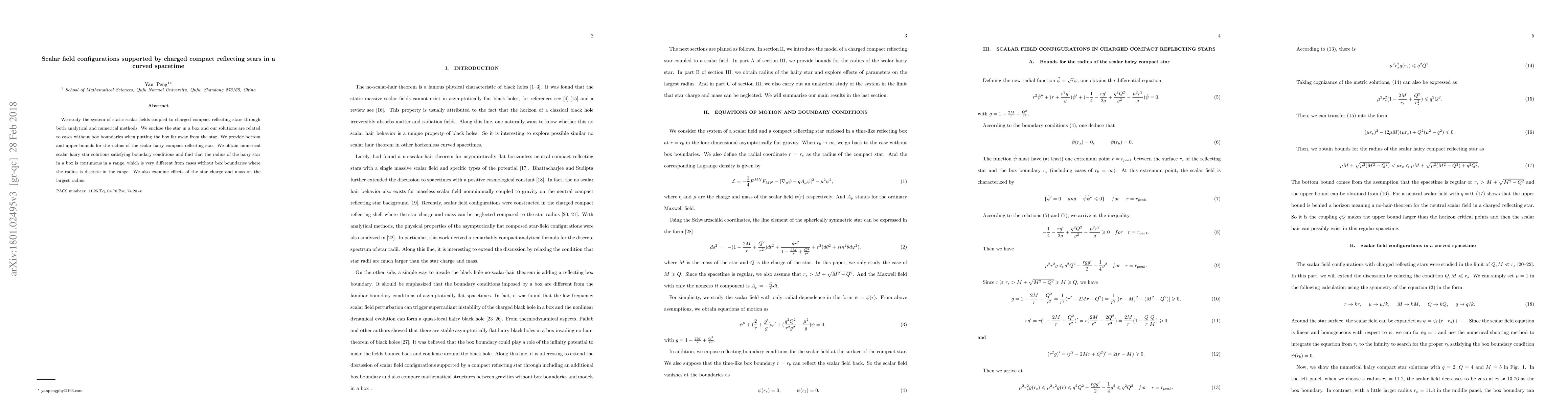 This paper investigates static scalar fields interacting with charged compact reflecting stars in curved spacetime, using both analytical and numerical methods. It finds that the radius of scalar hairy stars in a confined space is continuous, contrasting with discrete radii in unbounded cases, and examines the influence of star charge and mass on the star's maximum radius.