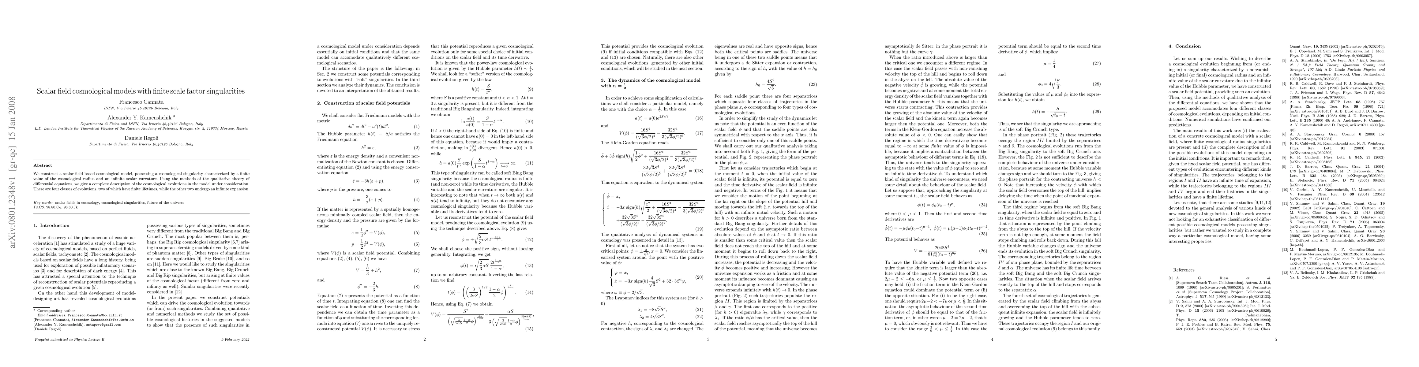 This paper constructs a scalar field cosmological model featuring a singularity with finite cosmological radius and infinite scalar curvature. It classifies four types of cosmological evolutions, two with finite lifetimes and two with infinite expansion, using qualitative differential equation theory.