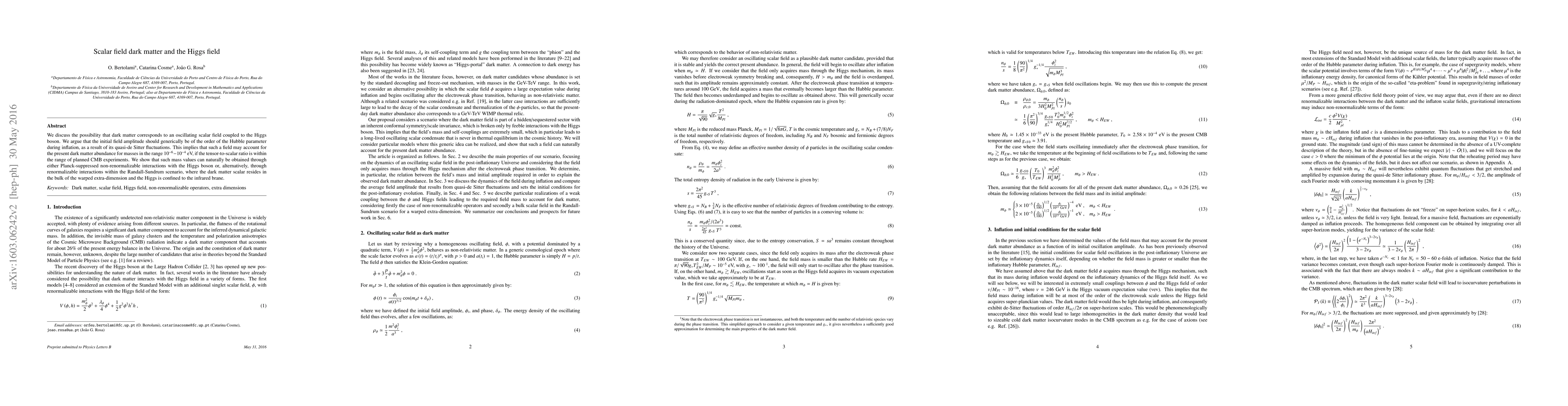 This paper explores the hypothesis that dark matter could be an oscillating scalar field linked to the Higgs boson, with initial amplitude tied to the Hubble parameter during inflation. It suggests that such a scalar field could explain the current dark matter abundance for masses between $10^{-6}$ and $10^{-4}$ eV, achievable via non-renormalizable interactions or through renormalizable interactions in the Randall-Sundrum model.