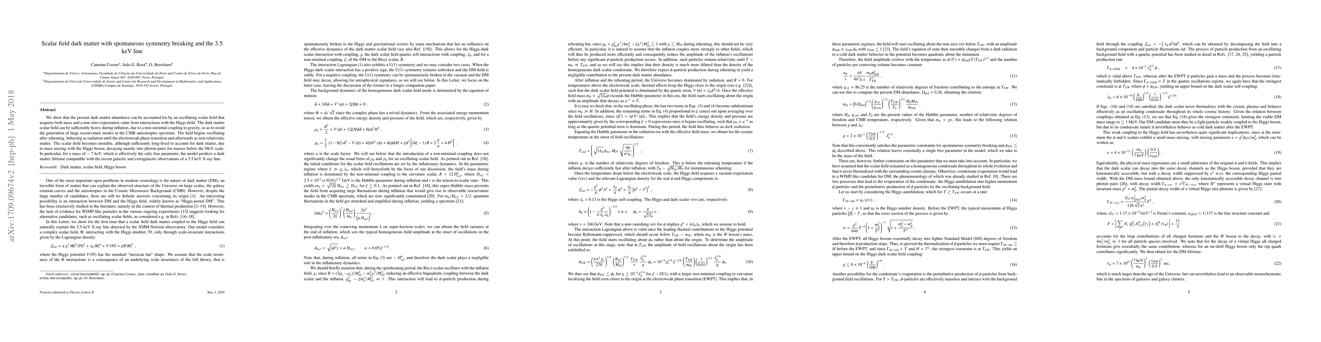 We show that the present dark matter abundance can be accounted for by an oscillating scalar field that acquires both mass and a non-zero expectation value from interactions with the Higgs field. The dark matter scalar field can be sufficiently heavy during inflation, due to a non-minimal coupling to gravity, so as to avoid the generation of large isocurvature modes in the CMB anisotropies spectrum. The field begins oscillating after reheating, behaving as radiation until the electroweak phase transition and afterwards as non-relativistic matter. The scalar field becomes unstable, although sufficiently long-lived to account for dark matter, due to mass mixing with the Higgs boson, decaying mainly into photon pairs for masses below the MeV scale. In particular, for a mass of $\sim 7$ keV, which is effectively the only free parameter, the model predicts a dark matter lifetime compatible with the recent galactic and extragalactic observations of a 3.5 keV X-ray line.