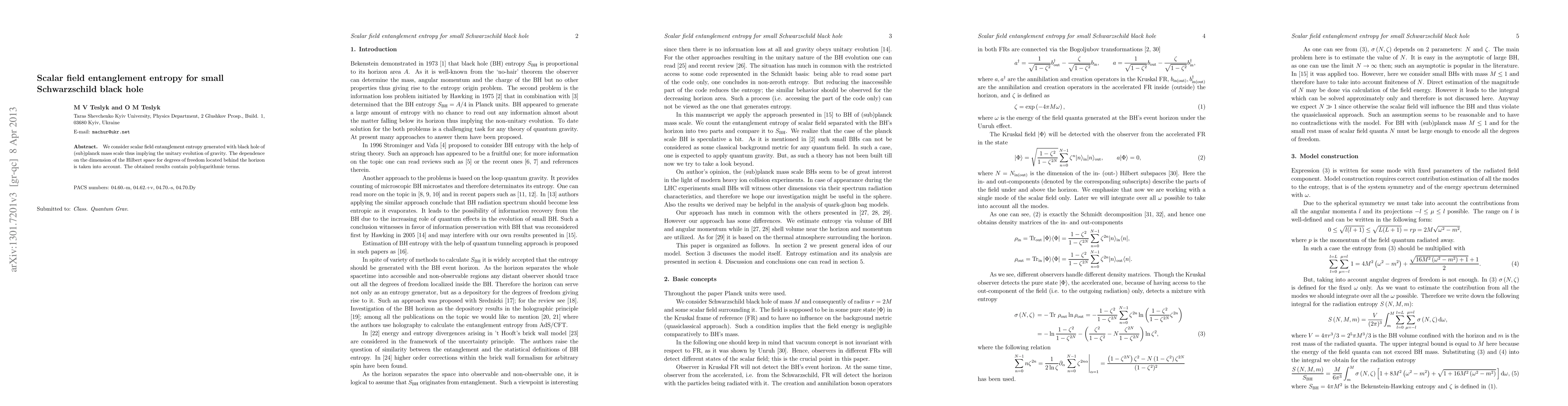 Summary: This paper examines the entanglement entropy in scalar fields around small Schwarzschild black holes, considering the dimension of the Hilbert space for degrees of freedom behind the event horizon and revealing polylogarithmic terms in the results. It implies unitary evolution of gravity at sub-Planck mass scales.