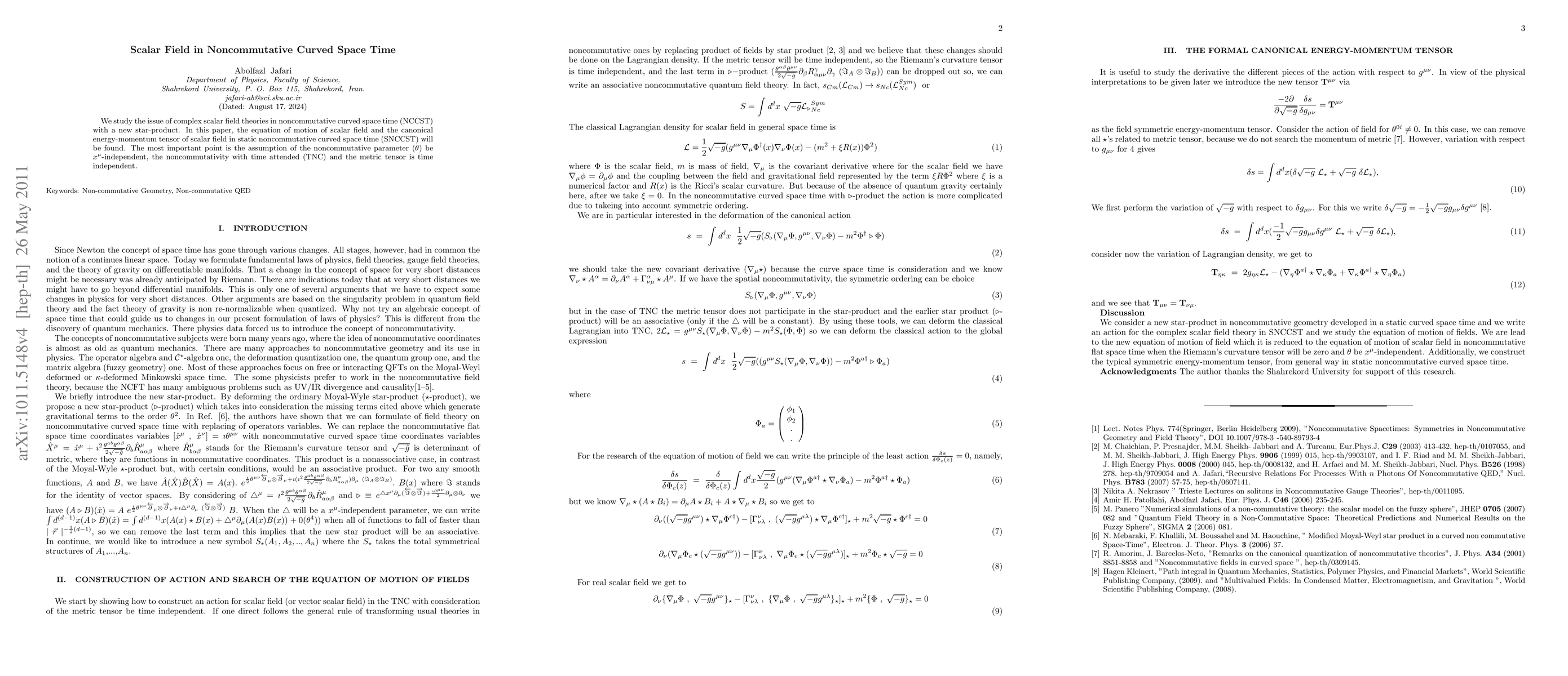 We study the issue of complex scalar field theories in noncommutative curved space time (NCCST) with a new star-product. In this paper, the equation of motion of scalar field and the canonical energy-momentum tensor of scalar field in static noncommutative curved space time (SNCCST) will be found. The most important point is the assumption of the noncommutative parameter ($\theta$) be $x^{\m}$-independent, the noncommutativity with time attended (TNC) and the metric tensor is time independent.