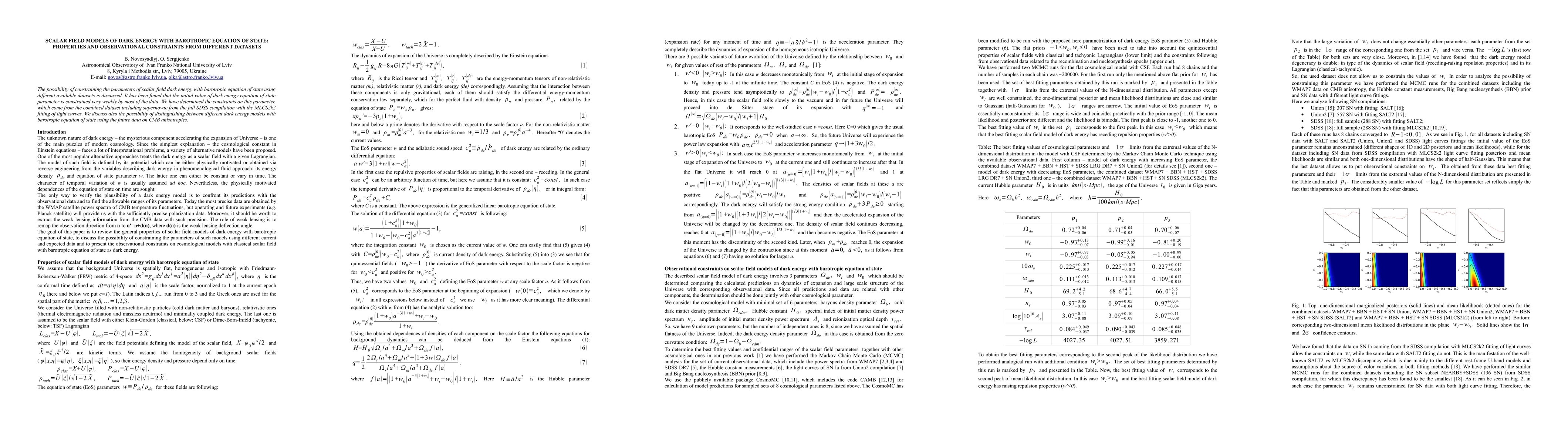 The possibility of constraining the parameters of scalar field dark energy with barotropic equation of state using different available datasets is discussed. It has been found that the initial value of dark energy equation of state parameter is constrained very weakly by most of the data. We have determined the constraints on this parameter, which come from the combined dataset including supernovae from the full SDSS compilation with the MLCS2k2 fitting of light curves. We discuss also the possibility of distinguishing between different dark energy models with barotropic equation of state using the future data on CMB anisotropies.