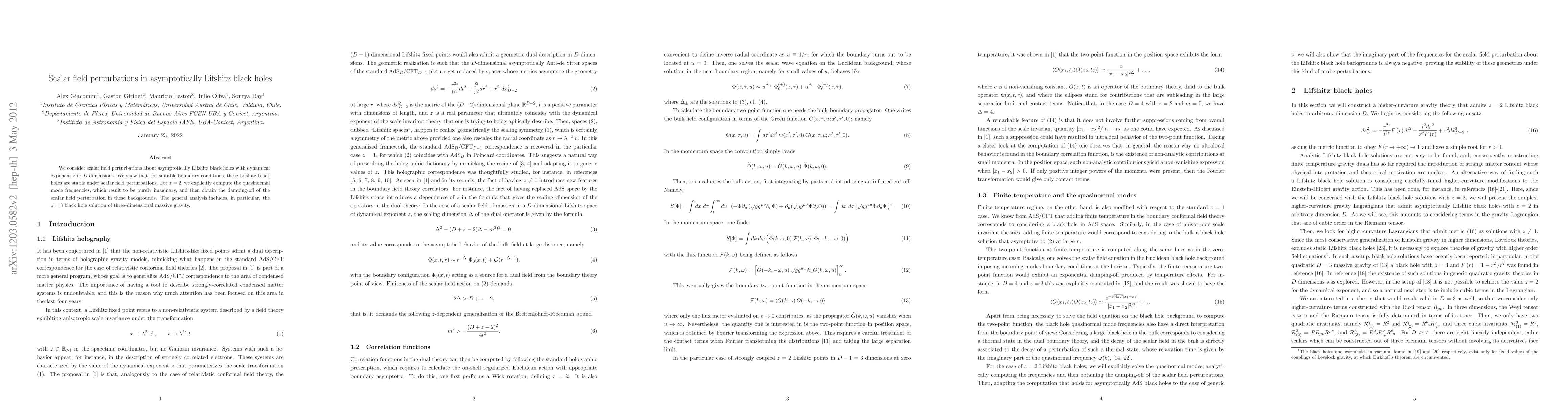 The paper investigates the stability of asymptotically Lifshitz black holes under scalar field perturbations and finds stability for suitable boundary conditions. For z=2, it explicitly computes quasinormal mode frequencies, showing purely imaginary results and confirming the damping-off of scalar perturbations.