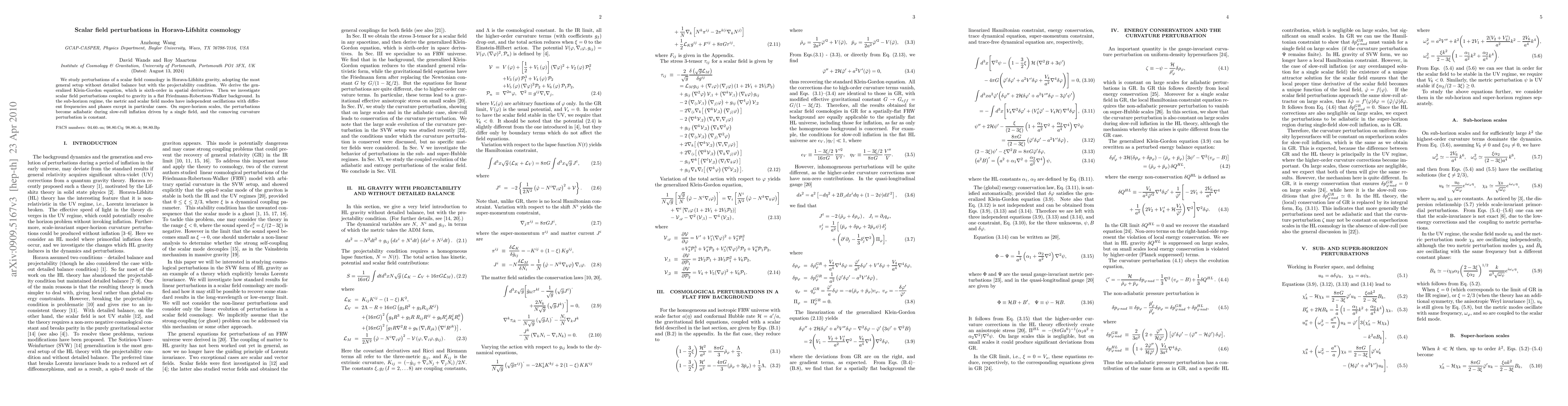 This paper investigates scalar field perturbations in Horava-Lifshitz cosmology, deriving a sixth-order Klein-Gordon equation for the perturbations. It finds that in the sub-horizon regime, metric and scalar field modes oscillate independently, while on super-horizon scales, perturbations become adiabatic during slow-roll inflation, maintaining constant comoving curvature perturbations.