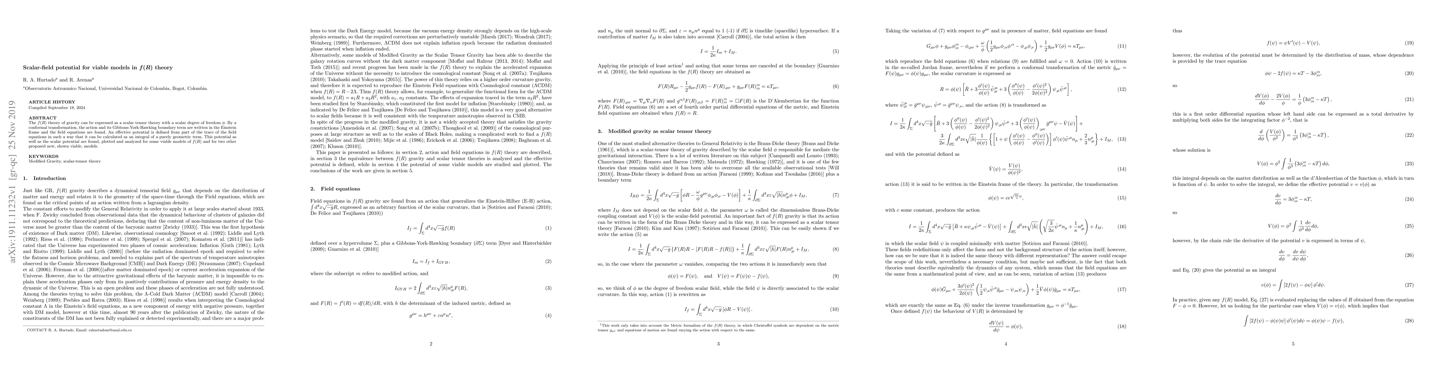 The $f(R)$ theory of gravity can be expressed as a scalar tensor theory with a scalar degree of freedom $\phi$. By a conformal transformation, the action and its Gibbons-York-Hawking boundary term are written in the Einstein frame and the field equations are found. An effective potential is defined from part of the trace of the field equations in such a way that it can be calculated as an integral of a purely geometric term. This potential as well as the scalar potential are found, plotted and analyzed for some viable models of $f(R)$ and for two other proposed new, shown viable, models.