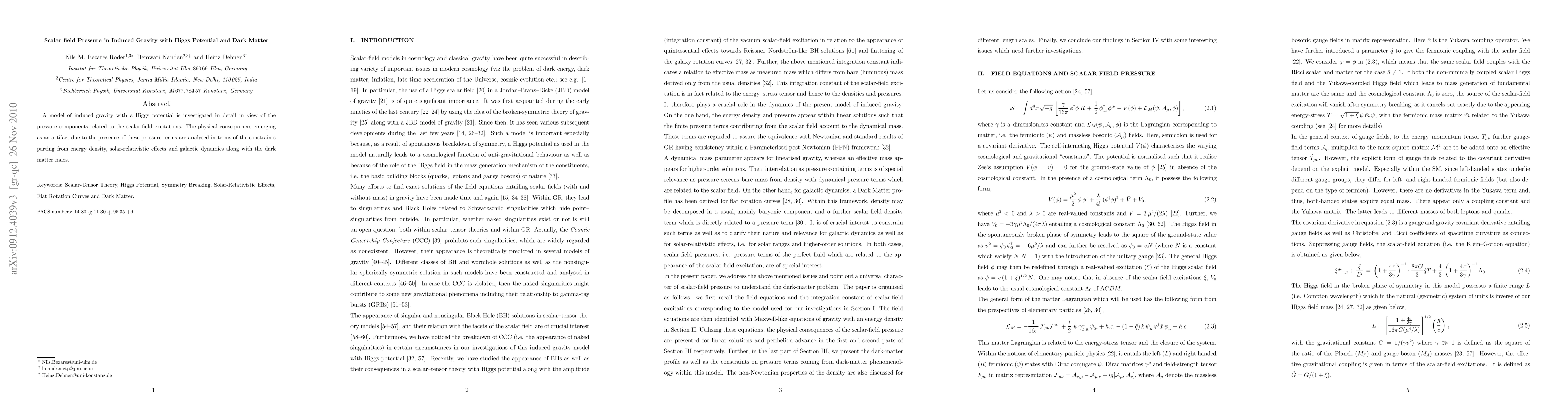 A model of induced gravity with a Higgs potential is investigated in detail in view of the pressure components related to the scalar-field excitations. The physical consequences emerging as an artifact due to the presence of these pressure terms are analysed in terms of the constraints parting from energy density, solar-relativistic effects and galactic dynamics along with the dark matter halos.
