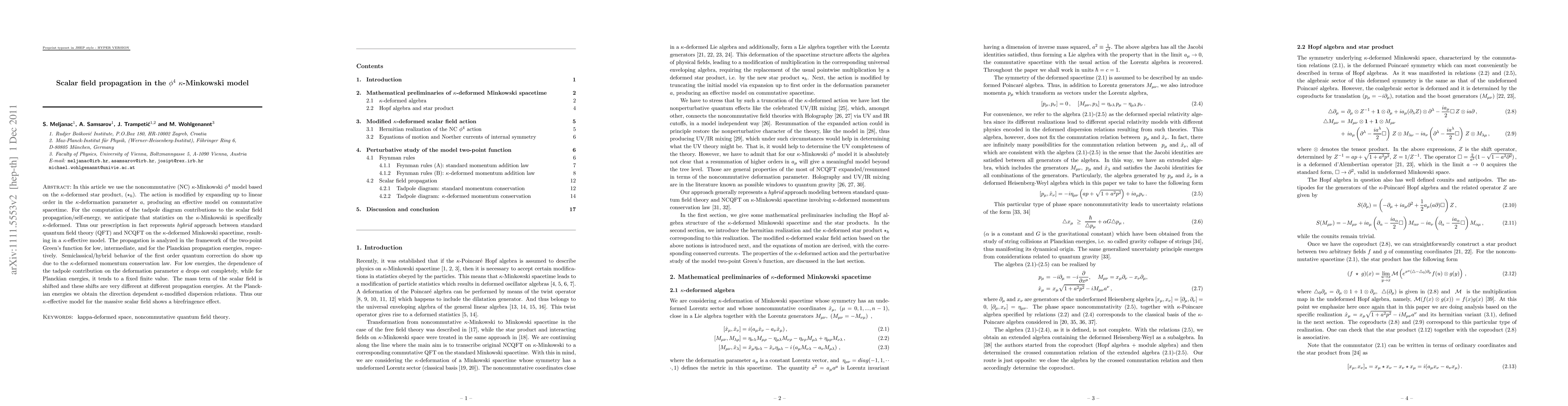 This paper investigates scalar field propagation in a kappa-Minkowski phi^4 model, using a hybrid approach combining standard QFT and noncommutative QFT. The study reveals that tadpole contributions depend on the kappa-deformation parameter, with distinct mass shifts and birefringence effects at Planckian energies.