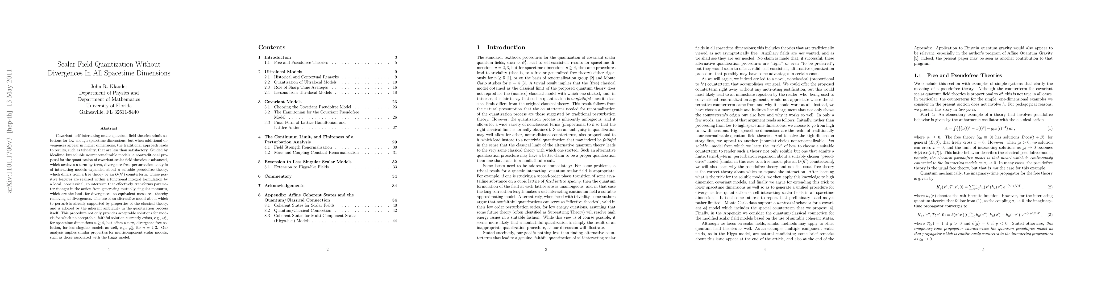 Covariant, self-interacting scalar quantum field theories admit solutions for low enough spacetime dimensions, but when additional divergences appear in higher dimensions, the traditional approach leads to results, such as triviality, that are less than satisfactory. Guided by idealized but soluble {\it non}renormalizable models, a nontraditional proposal for the quantization of covariant scalar field theories is advanced, which achieves a term-by-term, divergence-free, perturbation analysis of interacting models expanded about a suitable pseudofree theory, which differs from a free theory by an O(\hbar^2) counterterm. These positive features are realized within a functional integral formulation by a local, nonclassical, counterterm that effectively transforms parameter changes in the action from generating mutually singular measures, which are the basis for divergences, to equivalent measures, thereby removing all divergences. The use of an alternative model about which to perturb is already supported by properties of the classical theory, and is allowed by the inherent ambiguity in the quantization process itself. This procedure not only provides acceptable solutions for models for which no acceptable, faithful solution currently exists, e.g., \phi^4_n, for spacetime dimensions n\ge4, but offers a new, divergence-free solution, for less-singular models as well, e.g., \phi^4_n, for n=2,3. Our analysis implies similar properties for multicomponent scalar models, such as those associated with the Higgs model.