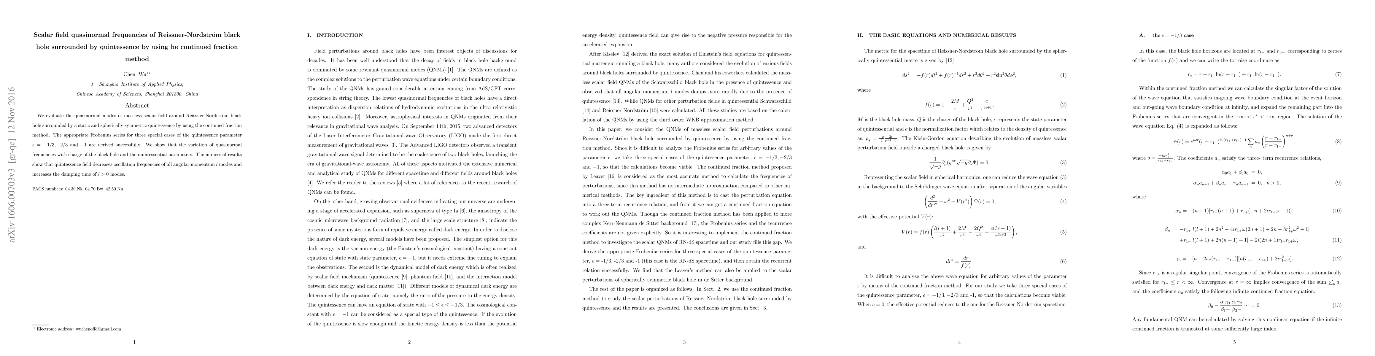 This paper evaluates the quasinormal frequencies of a massless scalar field around a Reissner-Nordström black hole enveloped by quintessence using the continued fraction method. It finds that the quintessence field decreases oscillation frequencies and increases damping time for higher angular momentum modes.