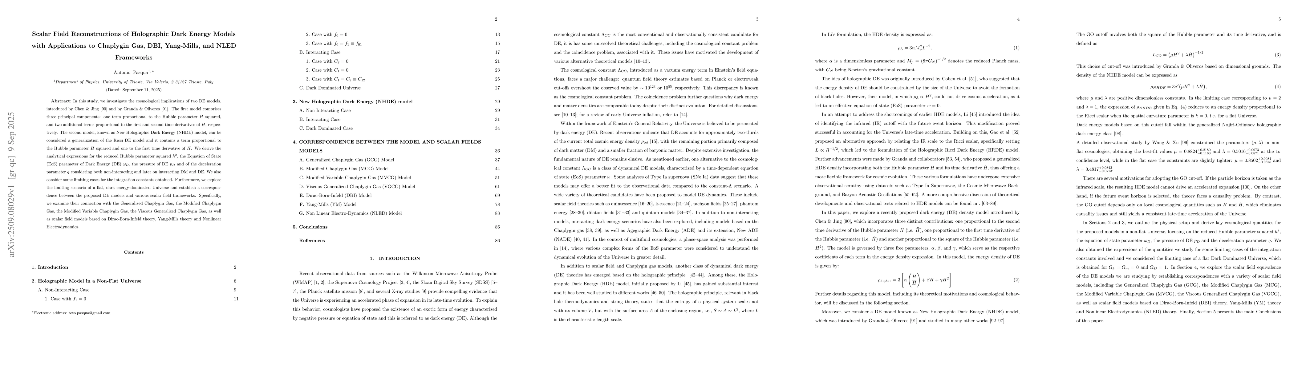 In this study, we investigate the cosmological implications of two DE models, introduced by Chen \& Jing \cite{modelhigher} and by Granda \& Oliveros \cite{gohnde}. The first model comprises three principal components: one term proportional to the Hubble parameter $ H$ squared, and two additional terms proportional to the first and second time derivatives of $ H $, respectively. The second model, known as New Holographic Dark Energy (NHDE) model, can be considered a generalization of the Ricci DE model and it contains a term proportional to the Hubble parameter $H$ squared and one to the first time derivative of $H$. We derive the analytical expressions for the reduced Hubble parameter squared $h^2$, the Equation of State (EoS) parameter of Dark Energy (DE) $\omega_D $, the pressure of DE $p_D$ and of the deceleration parameter $q $ considering both non-interacting and later on interacting DM and DE. We also consider some limiting cases for the integration constants obtained. Furthermore, we explore the limiting scenario of a flat, dark energy-dominated Universe and establish a correspondence between the proposed DE models and various scalar field frameworks. Specifically, we examine their connection with the Generalized Chaplygin Gas, the Modified Chaplygin Gas, the Modified Variable Chaplygin Gas, the Viscous Generalized Chaplygin Gas, as well as scalar field models based on Dirac-Born-Infeld theory, Yang-Mills theory and Nonlinear Electrodynamics.
