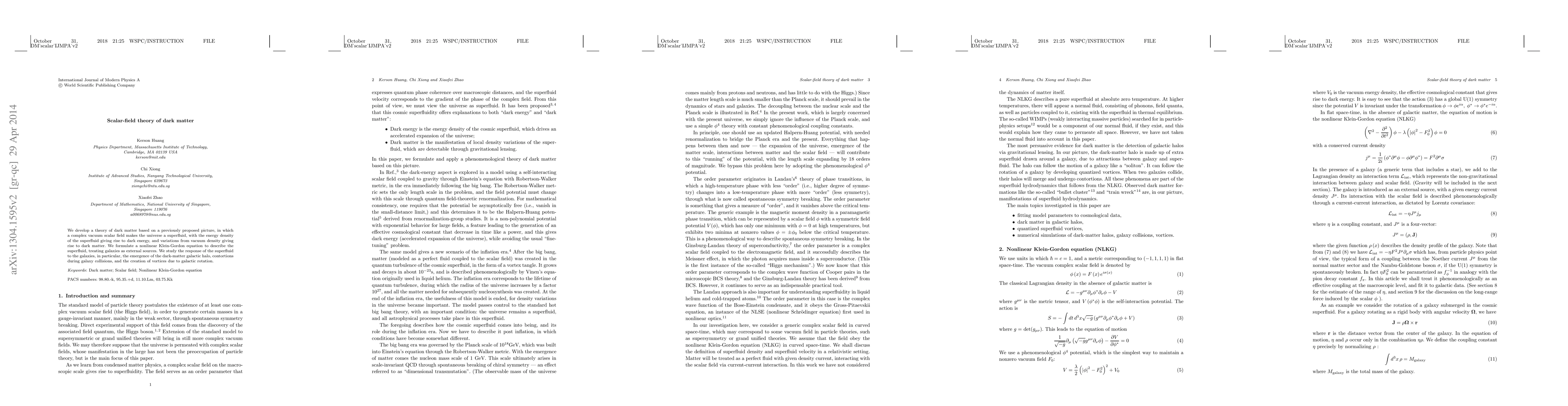 This paper proposes a scalar-field theory for dark matter where a complex vacuum scalar field forms a superfluid universe, generating dark energy and dark matter. The study uses a nonlinear Klein-Gordon equation to model the superfluid's response to galaxies, exploring phenomena like galactic halo formation, contortions during collisions, and vortex creation from rotation.