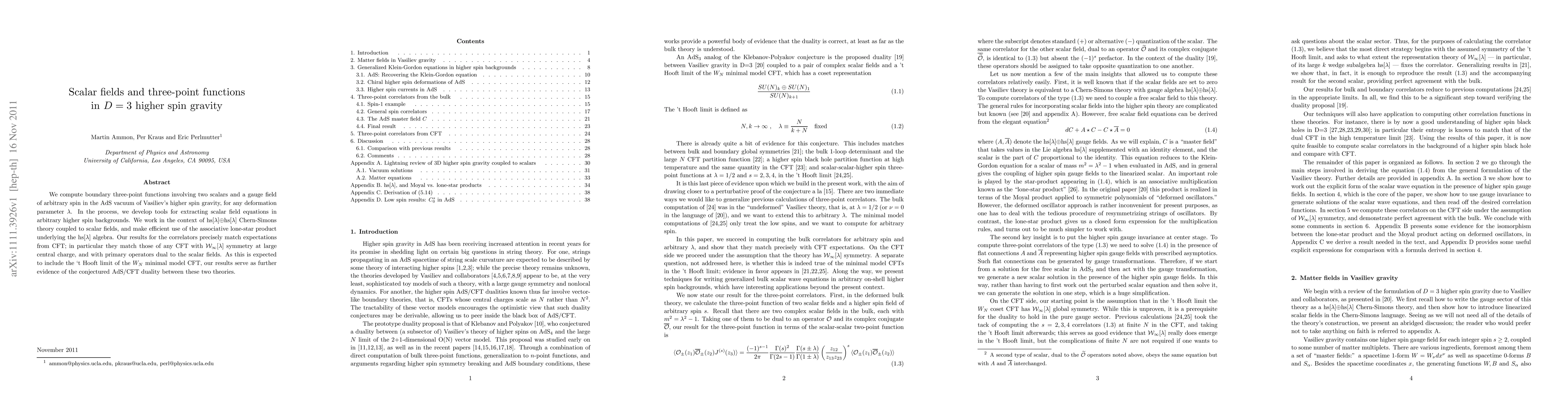 This paper computes three-point functions in D=3 higher spin gravity, focusing on scalars and gauge fields of arbitrary spin in AdS space, and develops tools for extracting scalar field equations in these backgrounds. The results match expectations from conformal field theories, supporting the conjectured AdS/CFT duality.