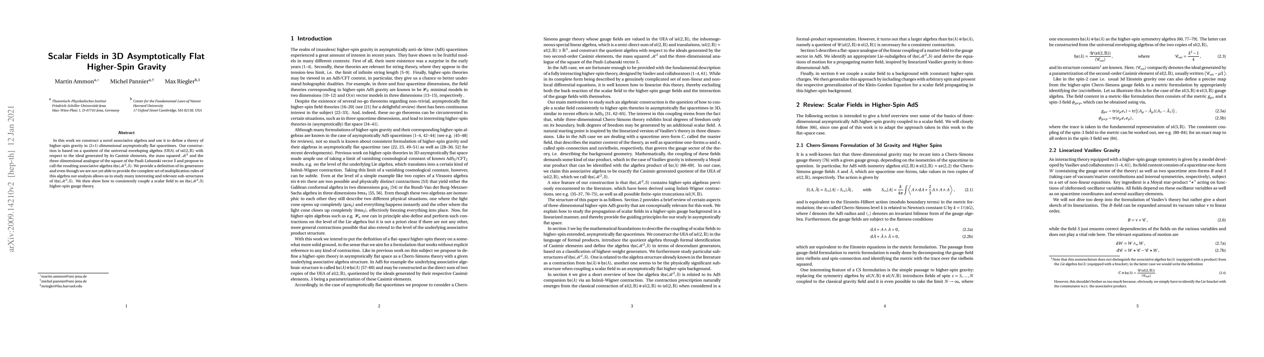 In this work we construct a novel associative algebra and use it to define a theory of higher-spin gravity in (2+1)-dimensional asymptotically flat spacetimes. Our construction is based on a quotient of the universal enveloping algebra (UEA) of $\mathfrak{isl}(2,\mathbb{R})$ with respect to the ideal generated by its Casimir elements, the mass squared $\mathcal{M}^2$ and the three-dimensional analogue of the square of the Pauli-Lubanski vector $\mathcal{S}$ and propose to call the resulting associative algebra $\mathfrak{ihs}(\mathcal{M}^2,\mathcal{S})$. We provide a definition of its generators and even though we are not yet able to provide the complete set of multiplication rules of this algebra our analysis allows us to study many interesting and relevant sub-structures of $\mathfrak{ihs}(\mathcal{M}^2,\mathcal{S})$. We then show how to consistently couple a scalar field to an $\mathfrak{ihs}(\mathcal{M}^2,\mathcal{S})$ higher-spin gauge theory.