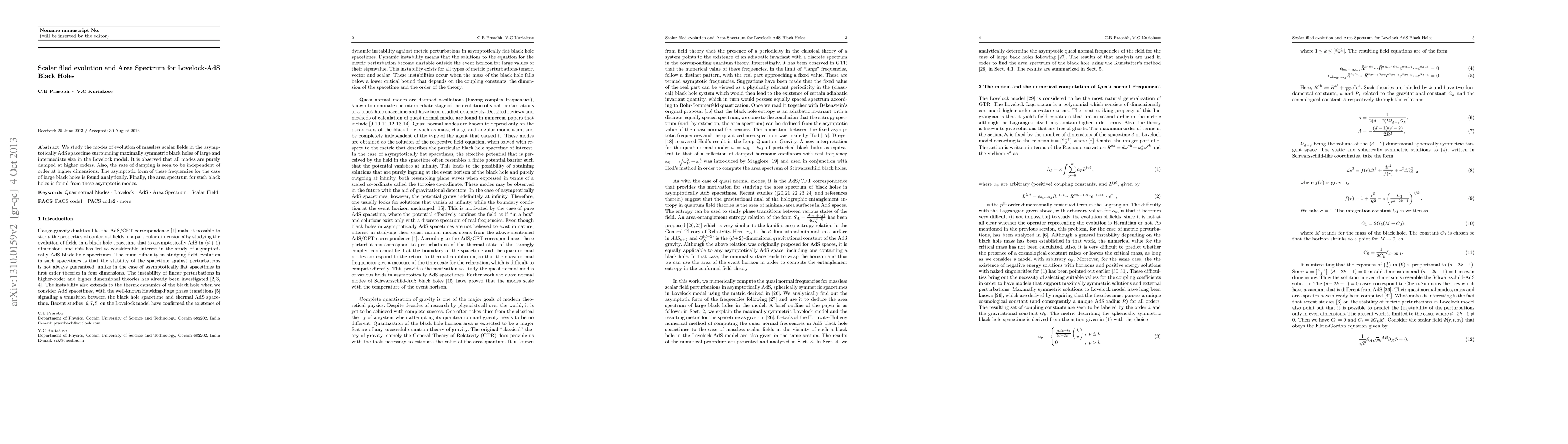We study the modes of evolution of massless scalar fields in the asymptotically AdS spacetime surrounding maximally symmetric black holes of large and intermediate size in the Lovelock model. It is observed that all modes are purely damped at higher orders. Also, the rate of damping is seen to be independent of order at higher dimensions. The asymptotic form of these frequencies for the case of large black holes is found analytically. Finally, the area spectrum for such black holes is found from these asymptotic modes.