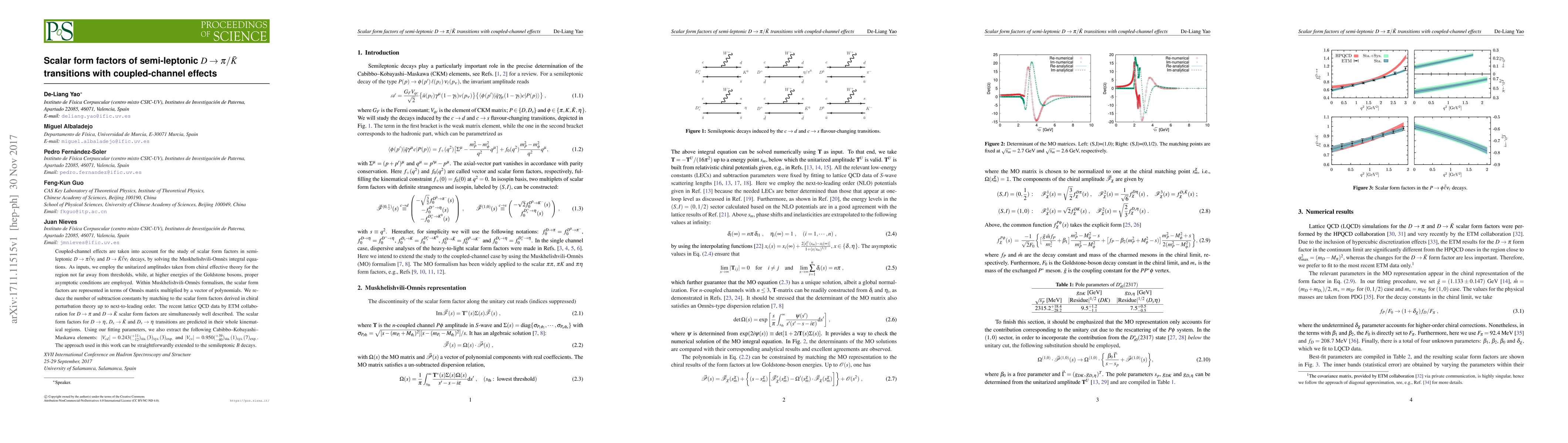 Coupled-channel effects are taken into account for the study of scalar form factors in semi-leptonic $D\to\pi\bar{\ell}\nu_\ell$ and $D\to \bar{K}\bar{\ell}\nu_\ell$ decays, by solving the Muskhelishvili-Omn\`es integral equations. As inputs, we employ the unitarized amplitudes taken from chiral effective theory for the region not far away from thresholds, while, at higher energies of the Goldstone bosons, proper asymptotic conditions are employed. Within Muskhelishvili-Omn\`es formalism, the scalar form factors are represented in terms of Omn\`es matrix multiplied by a vector of polynomials. We reduce the number of subtraction constants by matching to the scalar form factors derived in chiral perturbation theory up to next-to-leading order. The recent lattice QCD data by ETM collaboration for ${D\to\pi}$ and ${D\to\bar{K}}$ scalar form factors are simultaneously well described. The scalar form factors for $D\to\eta$, $D_s\to \bar{K}$ and $D_s\to \eta$ transitions are predicted in their whole kinematical regions. Using our fitting parameters, we also extract the following Cabibbo-Kobayashi-Maskawa elements: $|V_{cd}|=0.243(_{-12}^{+11})_{\rm sta.}({3})_{\rm sys.}(3)_{\rm exp.}$ and $|V_{cs}|=0.950(_{-40}^{+39})_{\rm sta.}(1)_{\rm sys.}(7)_{\rm exp.}$. The approach used in this work can be straightforwardly extended to the semileptonic $B$ decays.