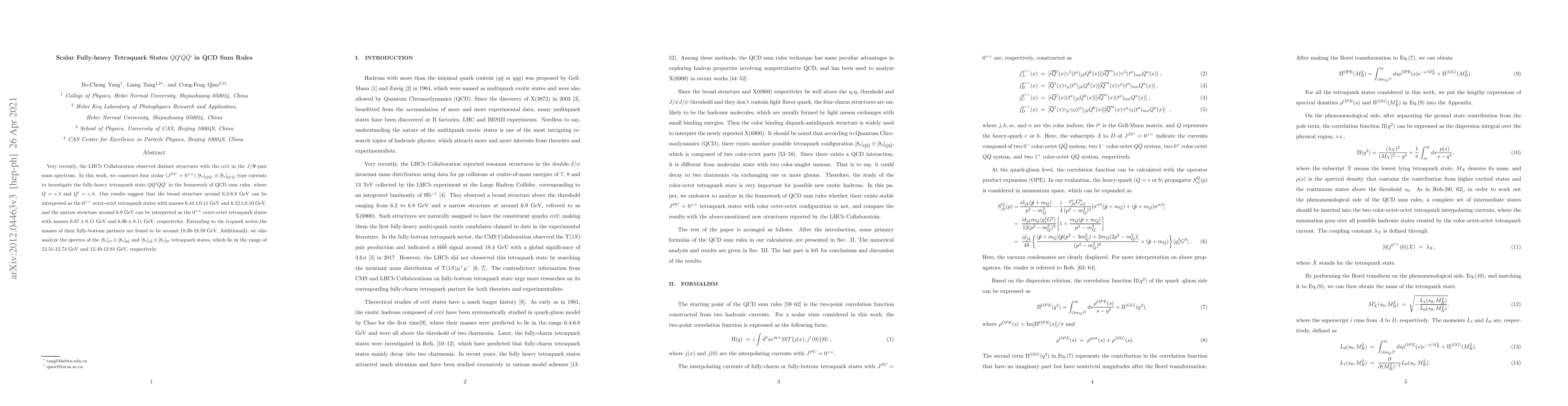 This research constructs QCD sum rules to investigate fully-heavy tetraquark states $QQ^\prime \bar{Q} \bar{Q^\prime}$ with $Q=c, b$ and $Q^\prime = c, b$. The study identifies scalar tetraquark states with masses around 6.4-6.9 GeV for charm quarks and 18.38-18.59 GeV for bottom quarks, providing a possible interpretation of recent LHCb observations.