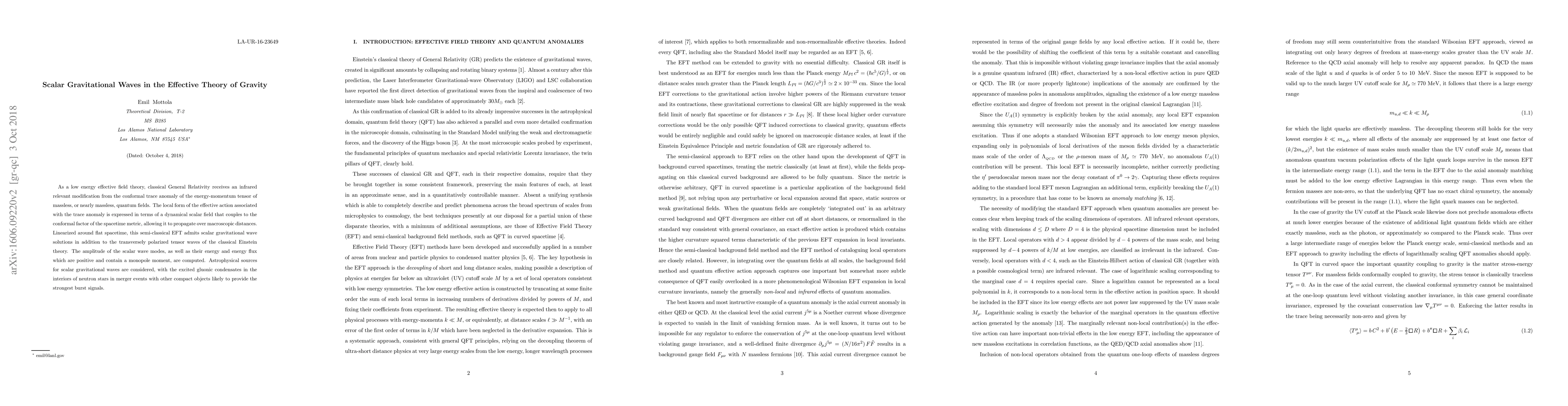 As a low energy effective field theory, classical General Relativity receives an infrared relevant modification from the conformal trace anomaly of the energy-momentum tensor of massless, or nearly massless, quantum fields. The local form of the effective action associated with the trace anomaly is expressed in terms of a dynamical scalar field that couples to the conformal factor of the spacetime metric, allowing it to propagate over macroscopic distances. Linearized around flat spacetime, this semi-classical EFT admits scalar gravitational wave solutions in addition to the transversely polarized tensor waves of the classical Einstein theory. The amplitude of the scalar wave modes, as well as their energy and energy flux which are positive and contain a monopole moment, are computed. Astrophysical sources for scalar gravitational waves are considered, with the excited gluonic condensates in the interiors of neutron stars in merger events with other compact objects likely to provide the strongest burst signals.