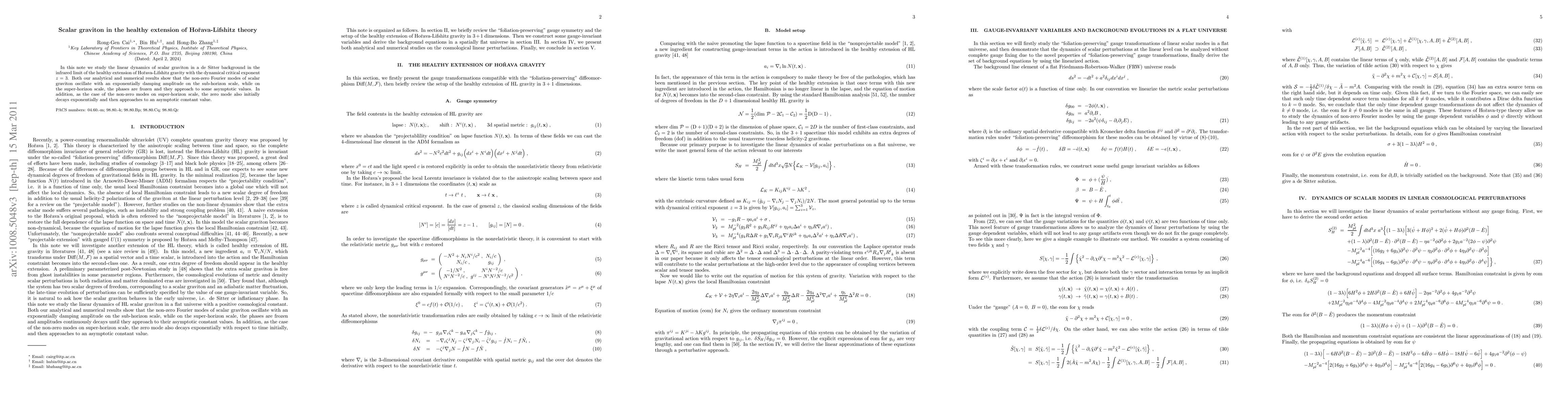 This paper investigates the linear dynamics of scalar gravitons in the healthy extension of Ho\v{r}ava-Lifshitz theory, revealing that non-zero Fourier modes exhibit exponential damping on sub-horizon scales and frozen phases on super-horizon scales. The zero mode also decays exponentially before stabilizing at a constant value.