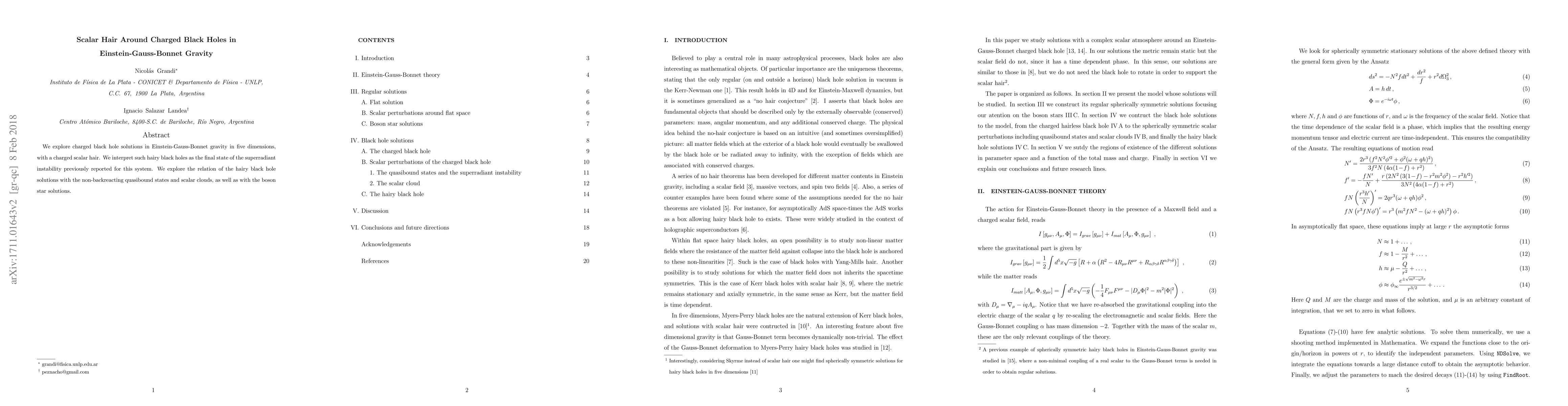 This paper investigates charged black holes with scalar hair in five-dimensional Einstein-Gauss-Bonnet gravity, interpreting these hairy solutions as the endpoint of superradiant instability. It also examines their connections to quasibound states, scalar clouds, and boson star solutions.