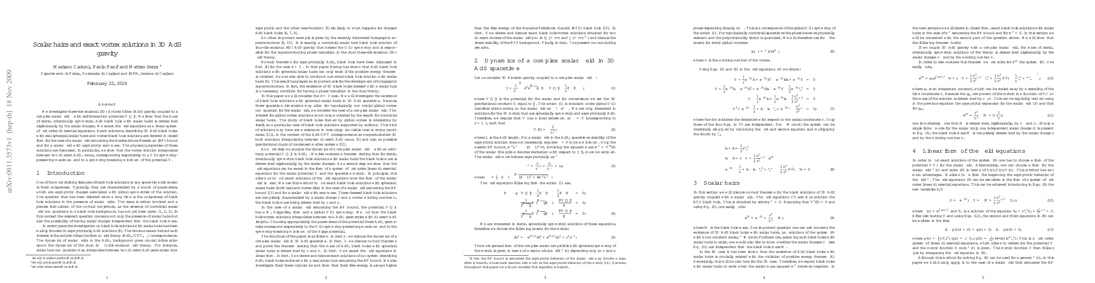 This paper explores 3D AdS gravity with a complex scalar field, deriving exact solutions for static, rotationally symmetric black holes with scalar hairs and vortex solutions. The mass of these black holes is determined by scalar charges, and the vortex solution connects two distinct AdS₃ vacua.