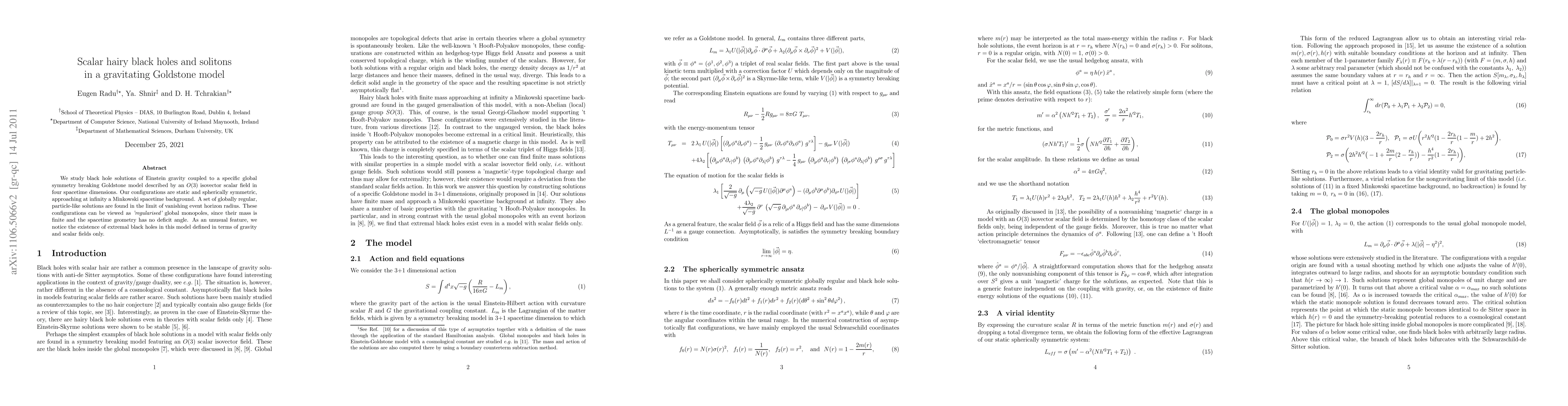 We study black hole solutions of Einstein gravity coupled to a specific global symmetry breaking Goldstone model described by an O(3) isovector scalar field in four spacetime dimensions. Our configurations are static and spherically symmetric, approaching at infinity a Minkowski spacetime background. A set of globally regular, particle-like solutions are found in the limit of vanishing event horizon radius. These configurations can be viewed as 'regularised' global monopoles, since their mass is finite and the spacetime geometry has no deficit angle. As an unusual feature, we notice the existence of extremal black holes in this model defined in terms of gravity and scalar fields only.
