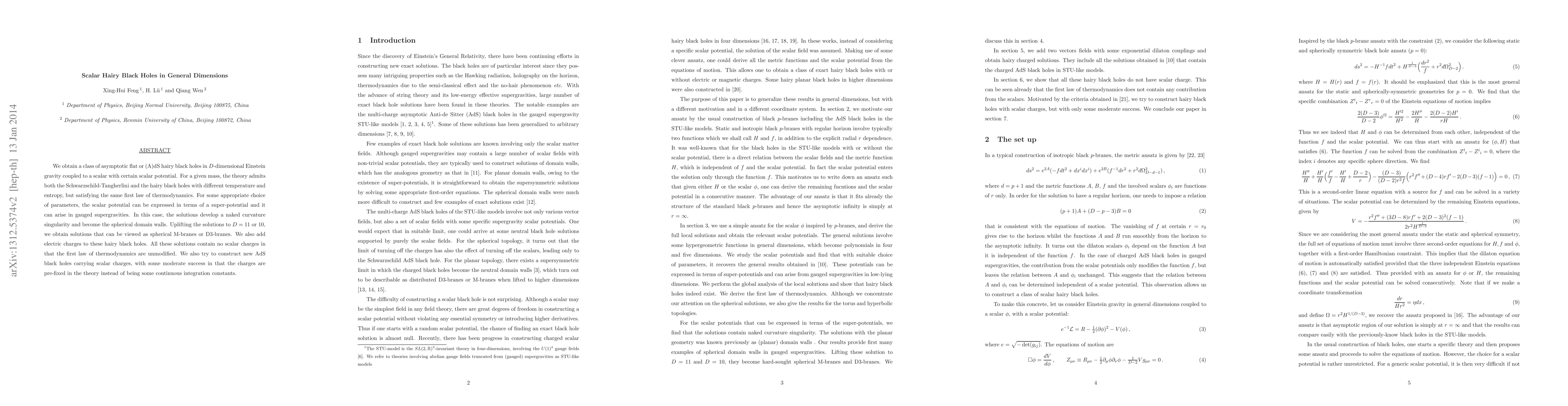 This paper explores scalar hairy black holes in D-dimensional Einstein gravity coupled with scalar fields, showing that they can exist alongside Schwarzschild-Tangherlini black holes with different thermodynamic properties. The study also investigates the potential uplift to higher dimensions, resulting in M-branes or D3-branes, and the addition of electric charges without altering scalar charges.