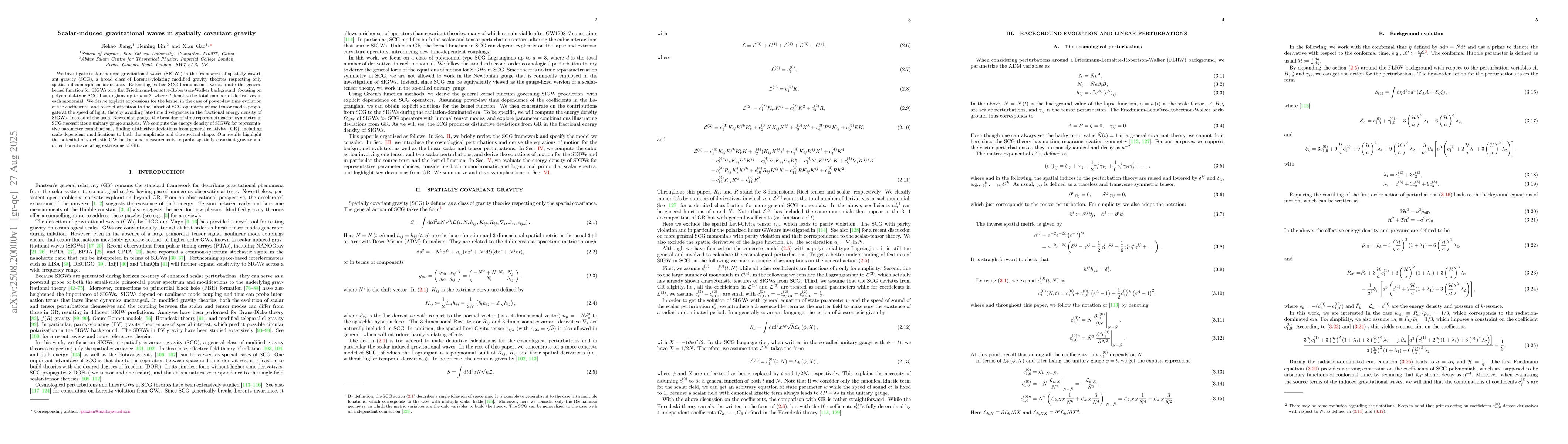 We investigate scalar-induced gravitational waves (SIGWs) in the framework of spatially covariant gravity (SCG), a broad class of Lorentz-violating modified gravity theories respecting only spatial diffeomorphism invariance. Extending earlier SCG formulations, we compute the general kernel function for SIGWs on a flat Friedmann-Lema\^itre-Robertson-Walker background, focusing on polynomial-type SCG Lagrangians up to $d=3$, where $d$ denotes the total number of derivatives in each monomial. We derive explicit expressions for the kernel in the case of power-law time evolution of the coefficients, and restrict attention to the subset of SCG operators whose tensor modes propagate at the speed of light, thereby avoiding late-time divergences in the fractional energy density of SIGWs. Instead of the usual Newtonian gauge, the breaking of time reparametrization symmetry in SCG necessitates a unitary gauge analysis. We compute the energy density of SIGWs for representative parameter combinations, finding distinctive deviations from general relativity (GR), including scale-dependent modifications to both the amplitude and the spectral shape. Our results highlight the potential of stochastic GW background measurements to probe spatially covariant gravity and other Lorentz-violating extensions of GR.