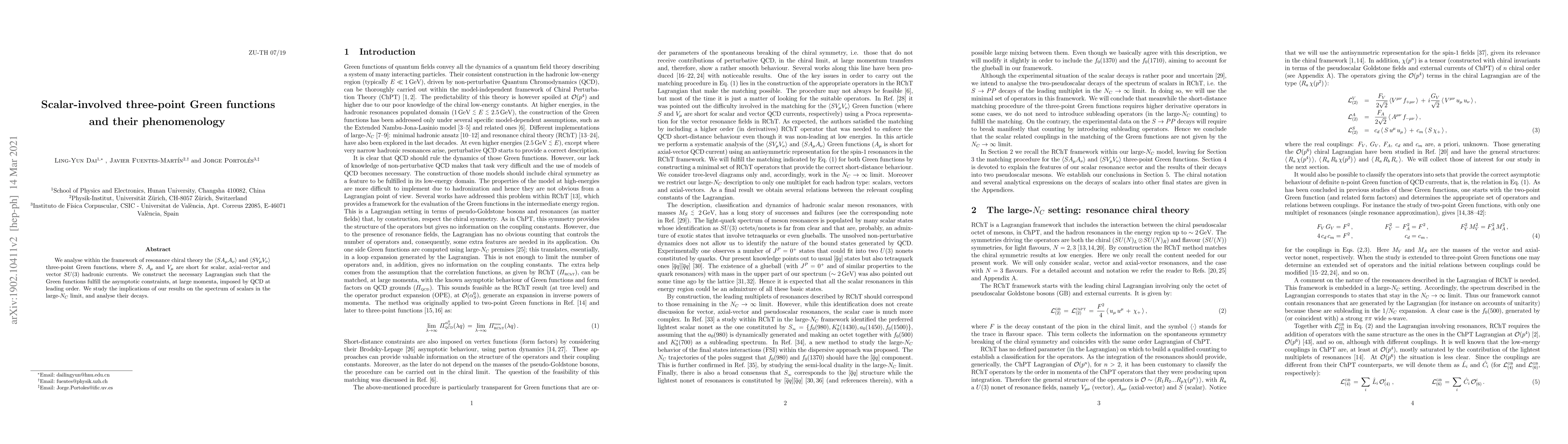We analyse within the framework of resonance chiral theory the $\langle SA_\mu A_\nu \rangle$ and $\langle SV_\mu V_\nu \rangle$ three-point Green functions, where $S$, $A_{\mu} $ and $V_{\mu}$ are short for scalar, axial-vector and vector $SU(3)$ hadronic currents. We construct the necessary Lagrangian such that the Green functions fulfill the asymptotic constraints, at large momenta, imposed by QCD at leading order. We study the implications of our results on the spectrum of scalars in the large-$N_C$ limit, and analyse their decays.