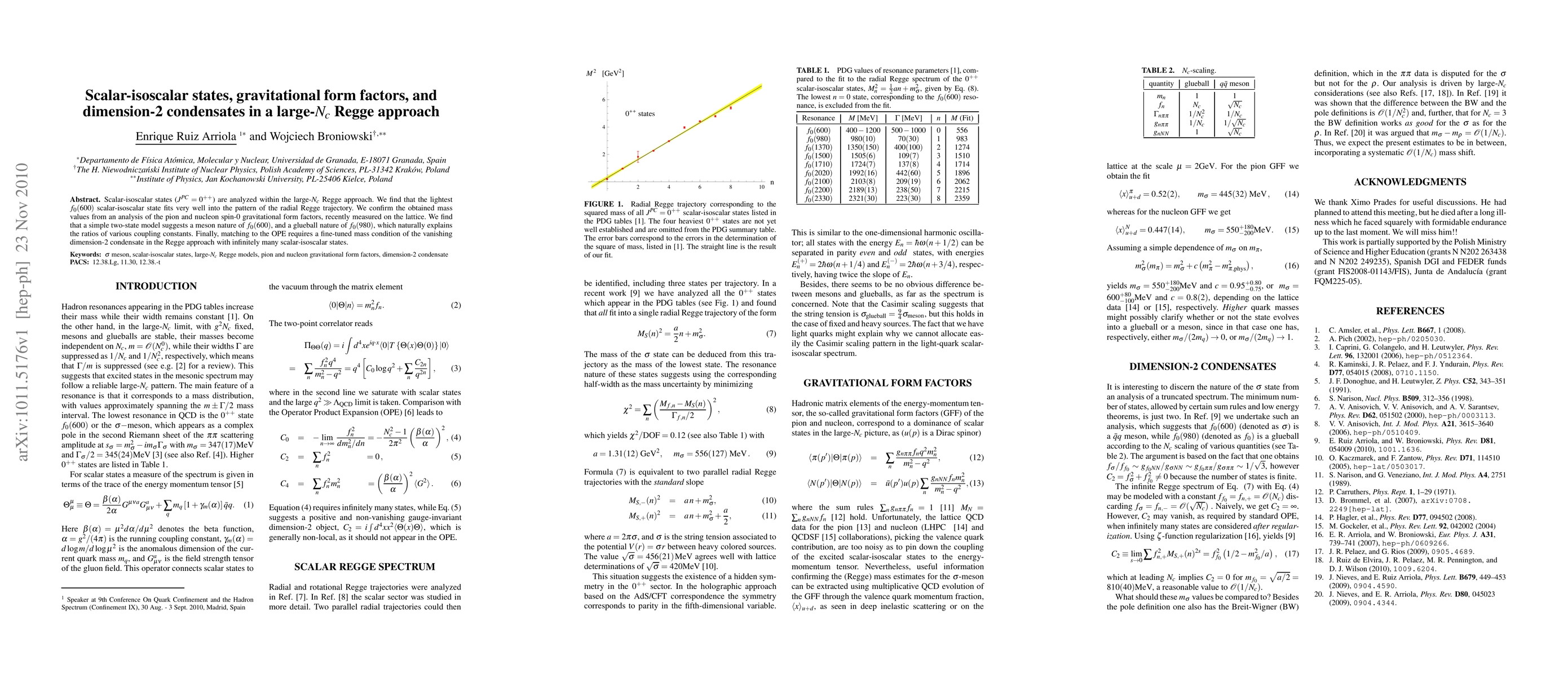 Scalar-isoscalar states are analyzed within the large-Nc Regge approach. We find that the lightest f0(600) scalar-isoscalar state fits very well into the pattern of the radial Regge trajectory. We confirm the obtained mass values from an analysis of the pion and nucleon spin-0 gravitational form factors, recently measured on the lattice. We find that a simple two-state model suggests a meson nature of f0(600), and a glueball nature of f0(980), which naturally explains the ratios of various coupling constants. Finally, matching to the OPE requires a fine-tuned mass condition of the vanishing dimension-2 condensate in the Regge approach with infinitely many scalar-isoscalar states.