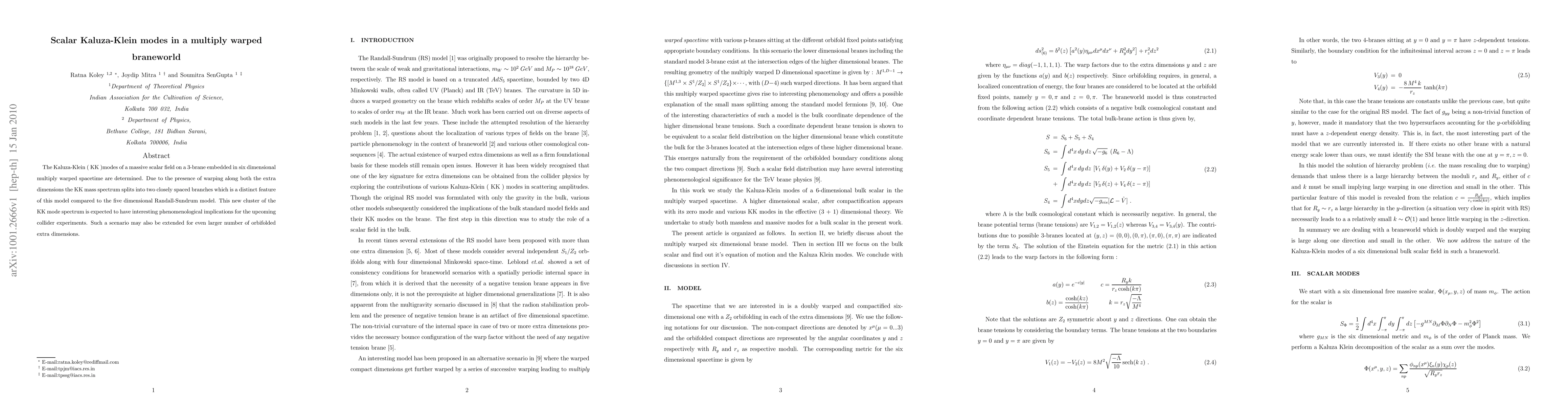 This paper investigates the Kaluza-Klein (KK) modes of a scalar field in a six-dimensional multiply warped braneworld, revealing a split KK mass spectrum due to warping in extra dimensions. The resulting distinct KK mode clusters may have significant implications for future collider experiments.