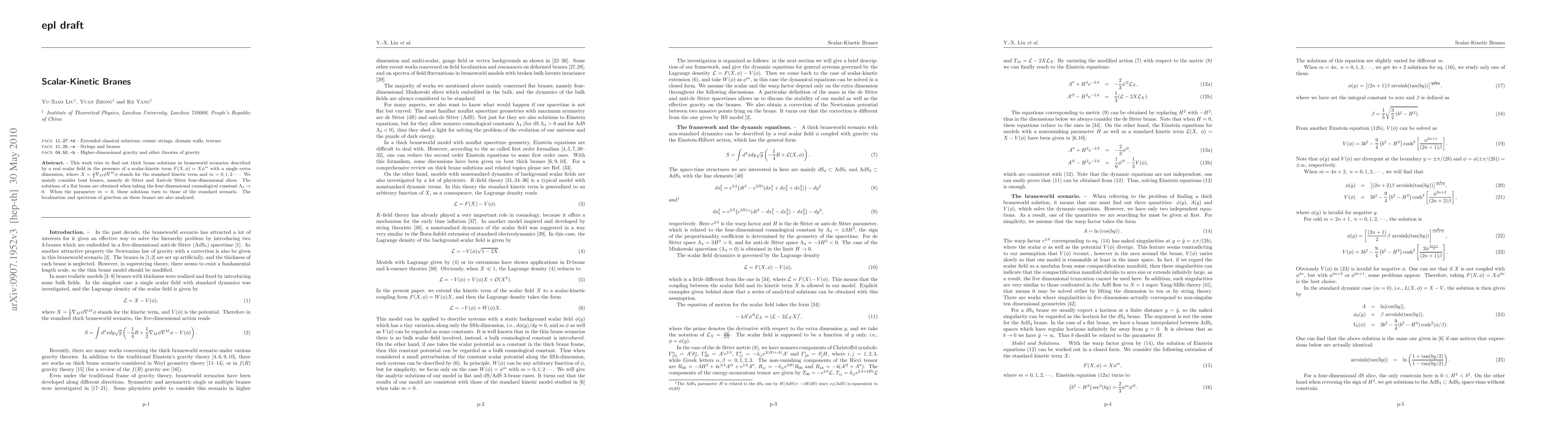 The paper presents a detailed analysis of thick brane solutions in braneworld scenarios with a modified scalar-kinetic term, deriving Einstein's equations and solving them for various cases of $m$.