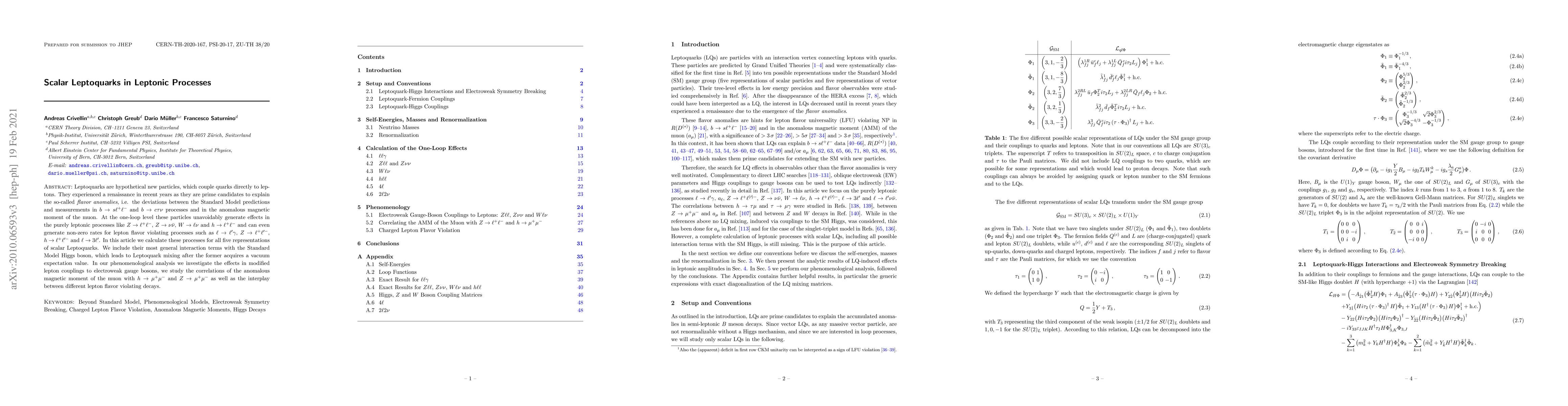 Leptoquarks are hypothetical new particles, which couple quarks directly to leptons. They experienced a renaissance in recent years as they are prime candidates to explain the so-called \textit{flavor anomalies}, i.e. the deviations between the Standard Model predictions and measurements in $b\to s\ell^{+}\ell^{-}$ and $b\to c\tau\nu$ processes and in the anomalous magnetic moment of the muon. At the one-loop level these particles unavoidably generate effects in the purely leptonic processes like $Z\to\ell^{+}\ell^{-}$, $Z\to\nu\bar\nu$, $W\to\ell\nu$ and $h\to\ell^{+}\ell^{-}$ and can even generate non-zero rates for lepton flavor violating processes such as $\ell\to \ell^{\prime}\gamma$, $Z\to\ell^+\ell^{\prime -}$, $h\to\ell^+\ell^{\prime -}$ and $\ell\to 3\ell^\prime$. In this article we calculate these processes for all five representations of scalar Leptoquarks. We include their most general interaction terms with the Standard Model Higgs boson, which leads to Leptoquark mixing after the former acquires a vacuum expectation value. In our phenomenological analysis we investigate the effects in modified lepton couplings to electroweak gauge bosons, we study the correlations of the anomalous magnetic moment of the muon with $h\to\mu^{+}\mu^{-}$ and $Z\to\mu^{+}\mu^{-}$ as well as the interplay between different lepton flavor violating decays.