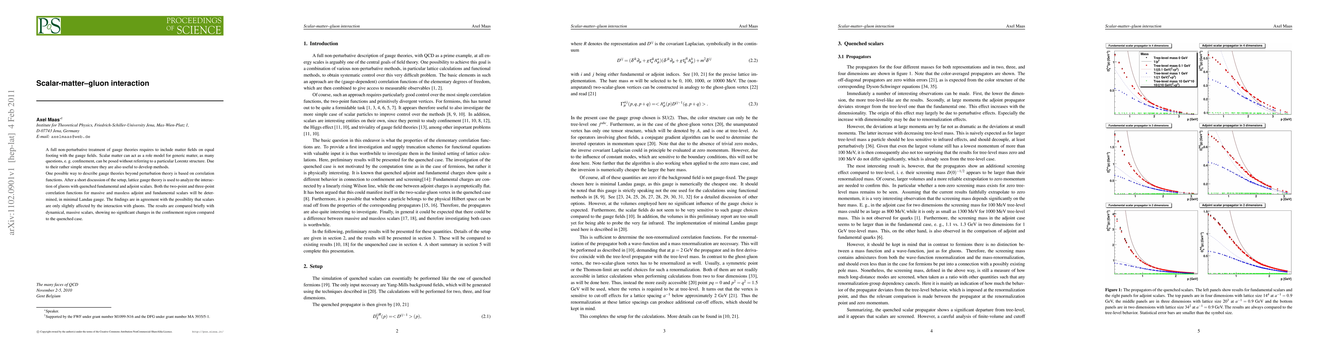 A full non-perturbative treatment of gauge theories requires to include matter fields on equal footing with the gauge fields. Scalar matter can act as a role model for generic matter, as many questions, e.g. confinement, can be posed without referring to a particular Lorentz structure. Due to their rather simple structure they are also useful to develop methods. One possible way to describe gauge theories beyond perturbation theory is based on correlation functions. After a short discussion of the setup, lattice gauge theory is used to analyze the interaction of gluons with quenched fundamental and adjoint scalars. Both the two-point and three-point correlation functions for massive and massless adjoint and fundamental scalars will be determined, in minimal Landau gauge. The findings are in agreement with the possibility that scalars are only slightly affected by the interaction with gluons. The results are compared briefly with dynamical, massive scalars, showing no significant changes in the confinement region compared to the quenched case.