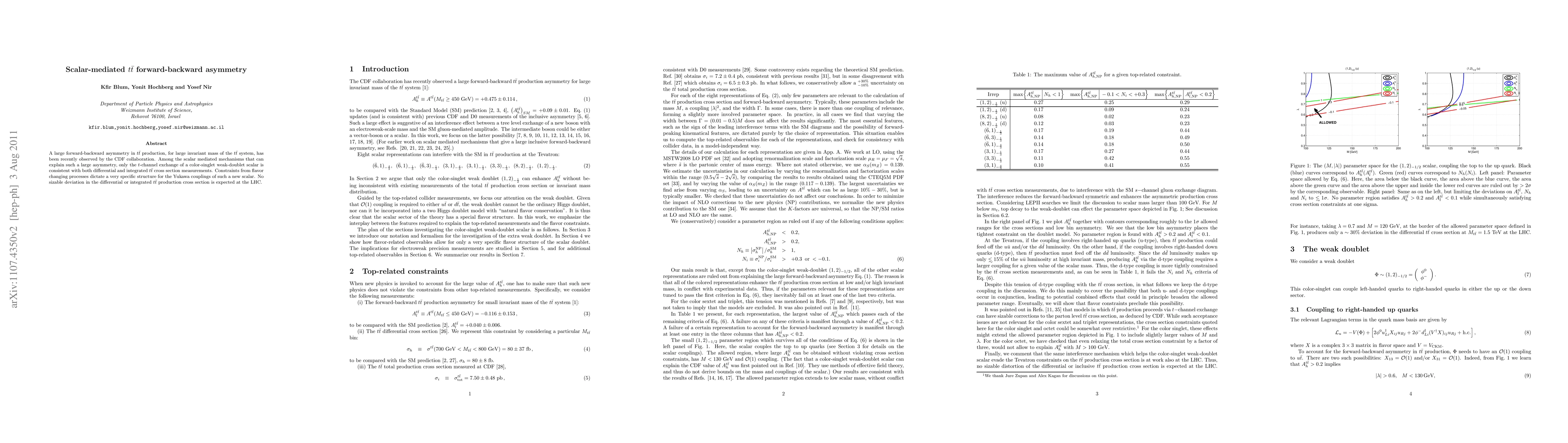 The CDF collaboration observed a large forward-backward asymmetry in top-antitop ($t\bar t$) production, which can be explained by a t-channel exchange of a color-singlet weak-doublet scalar. This mechanism aligns with both differential and integrated $t\bar t$ cross section measurements, while constraints from flavor changing processes dictate a specific structure for the Yukawa couplings of this new scalar.